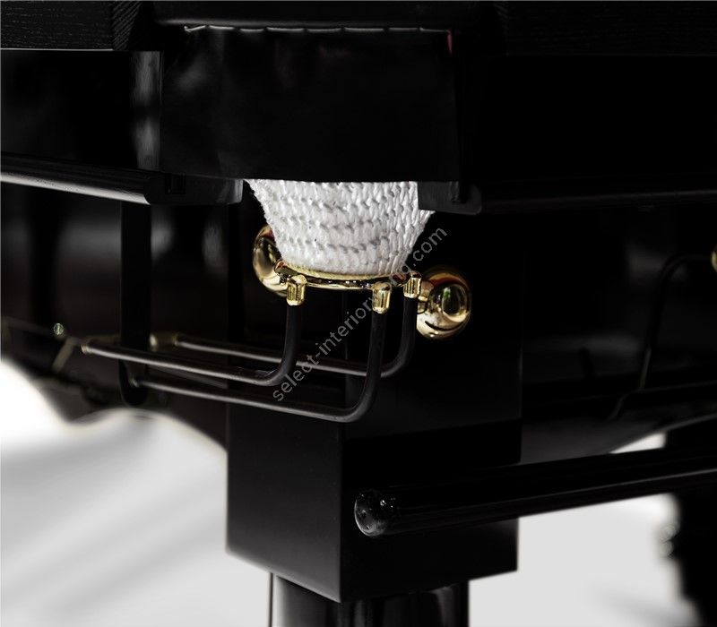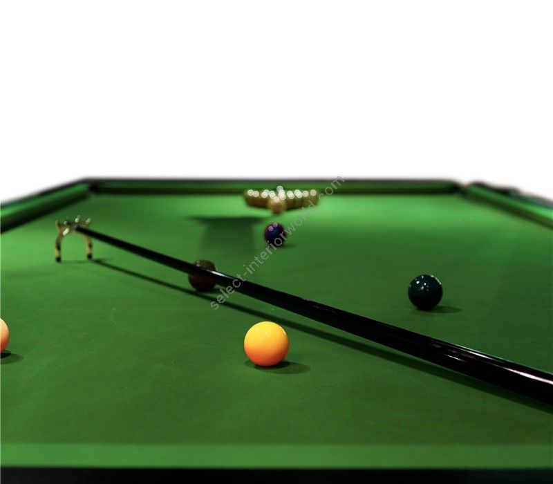 Structure in Birch veneer of 4cm plywood. Table with 8 legs made of black turned wood. Ash table with L red rubber for English snooker, and painted in black matte finish. Rails are in black lacquered wood with glossy varnish on top. Strachan Red cloth specific for English Snooker. Corners in aluminium and pockets lined with leather. Balls with 52.4 mm diameter. The cotton pocket is stitched in the upper corners. Snooker Table 10 feet.