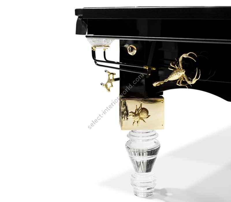 A playful and remarkable design imagined for those who appreciate the good things in life, finding beauty in the most unexpected places. An extraordinary English snooker table of 10 foot playground, founded by 8 statement designed black wood legs which portray unexpected chaos of high-end materials and unexpected casted brass black bugs and gold scorpions, for an emotional experience. With renowned Ronnie O’Sullivan cues with 9mm of diameter and a professional snooker kit, this contemporary snooker table certainly challenges the boundaries of game rooms and present day-luxe. A tribute to the darkest side of nature where challenges never seize to exist.