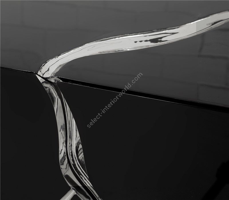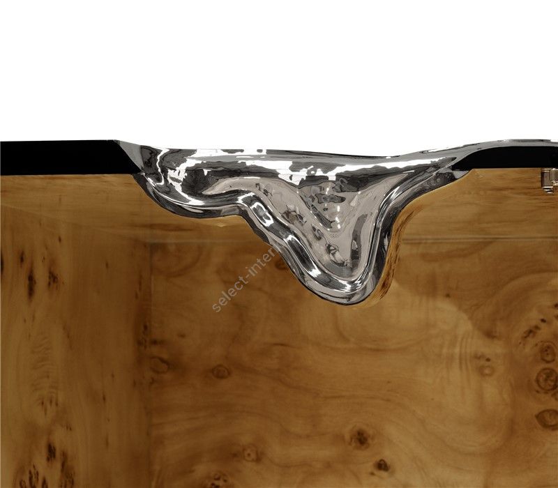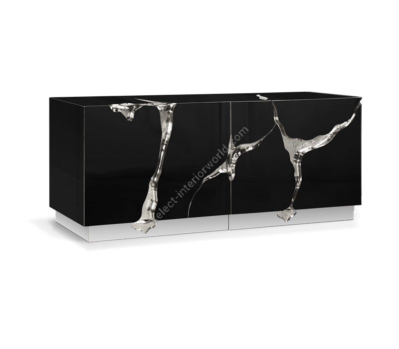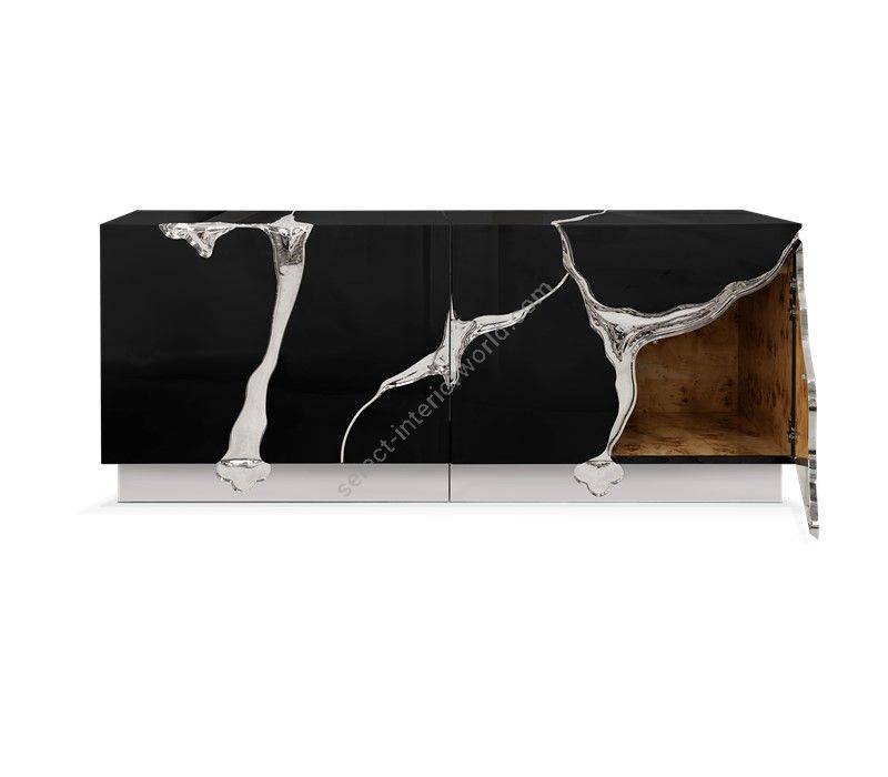Its organic features are achieved through the manual fitting of stainless steel, and a glossy black lacquer finish that bursts from the inside to the distinct exterior façades. Different-shaped doors and drawer are embellished by hammered silver details, conveying both sophistication and elegance to bring a new contemporary verve into refined interiors.