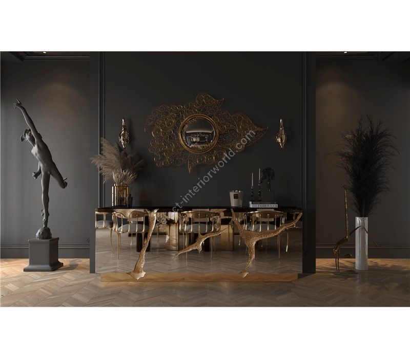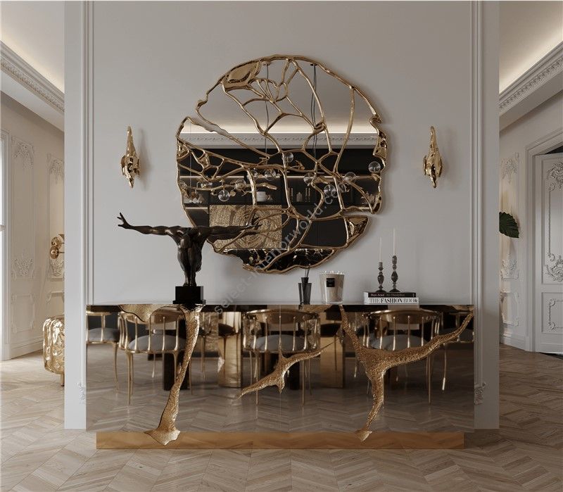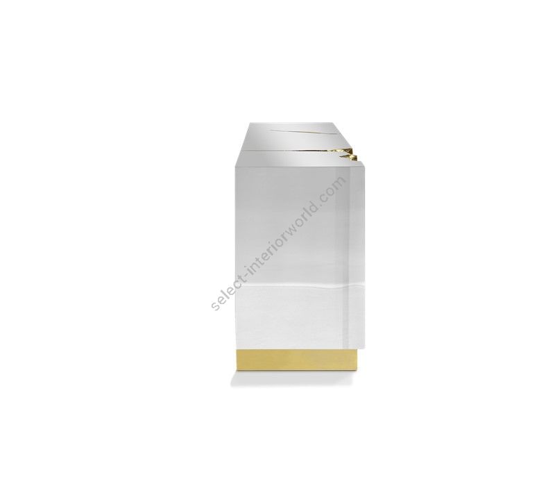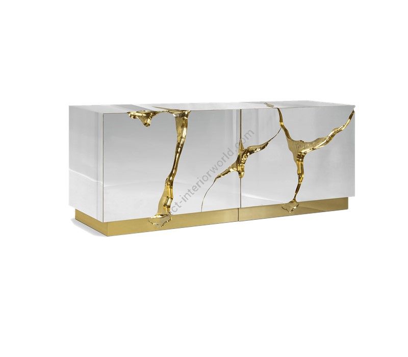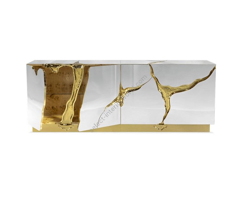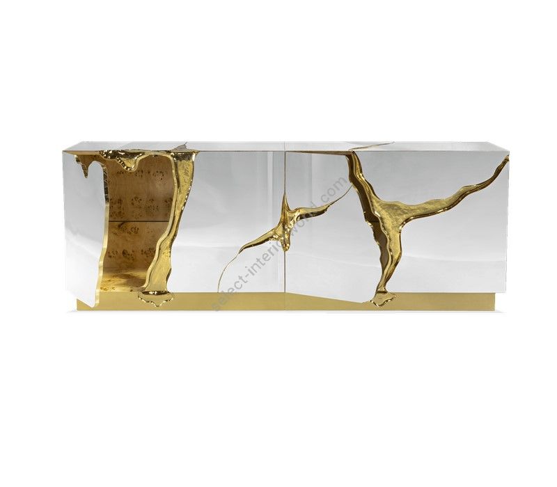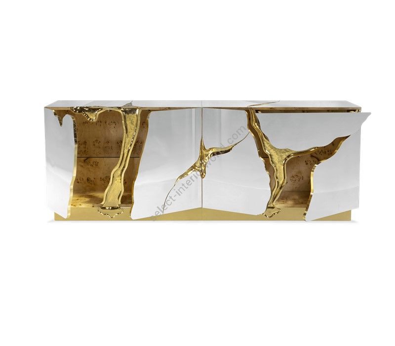 Lapiaz sideboard takes exceptional craftsmanship and design to a new realm. Finding beauty in the most unexpected places, this contemporary design piece is inspired by authentic karst formations. Its organic features are achieved through the manual fitting of polished brass, and a sharp finish in polished stainless steel that portrays a perfect mirror. Different-shaped doors and drawer open to a distinct poplar root wood veneer interior. The hammered gold details and the mirrored façade conveys both dynamics and elegance, a beautiful duality between power and refinement to bring a new contemporary verve into interior design. A functional artwork piece born from cold and freshly cracked to showing off the world rich, golden details.