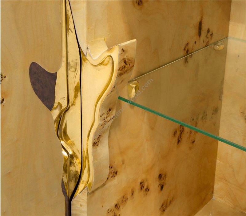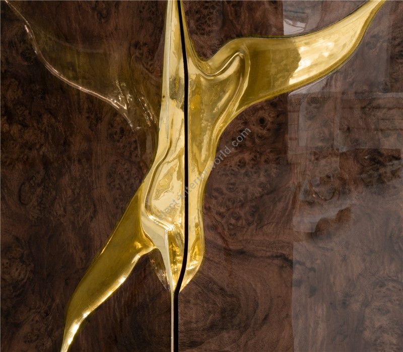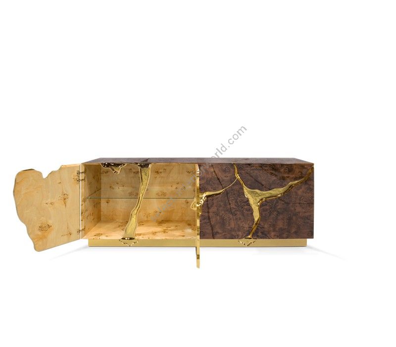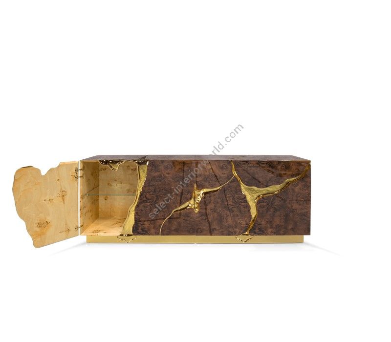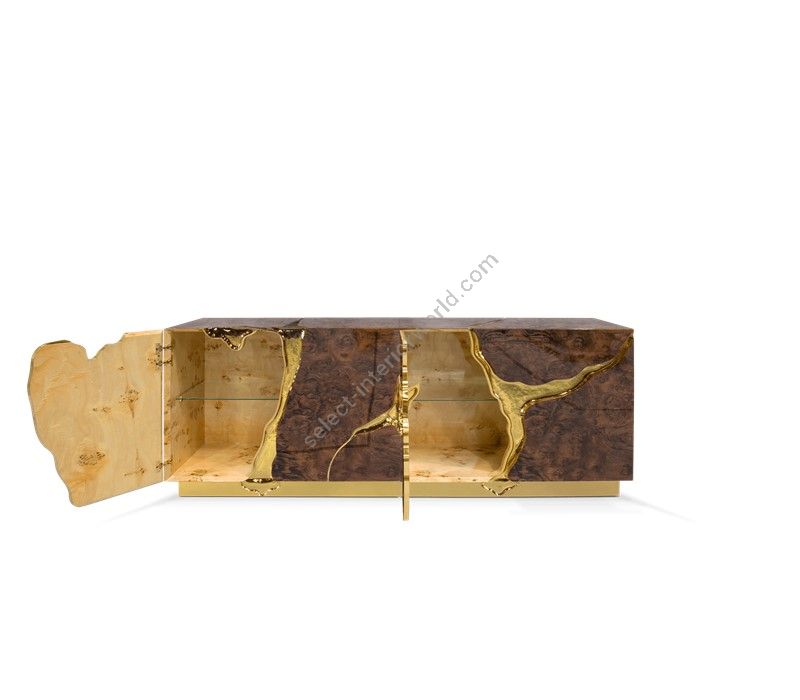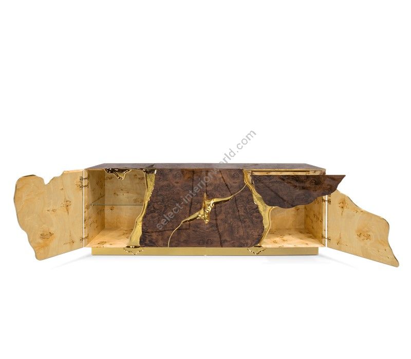 Lapiaz sideboard takes exceptional craftsmanship and design to a new realm. Its organic features are achieved through the manual fitting of polished brass, and a warmth walnut veneer finish that bursts from the inside to the distinct exterior façades. Different-shaped doors and drawer are embellished by hammered gold details, conveying both sophistication and elegance to bring a new contemporary verve into refined interiors.