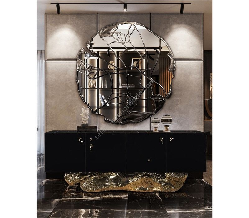 Sophisticated pulls in different organic shapes adorn four doors, each one opens to single drawers on each compartment. A wonderful journey through the know-how of the best craftsmanship that ends with exquisite Shara Noir marble on top.