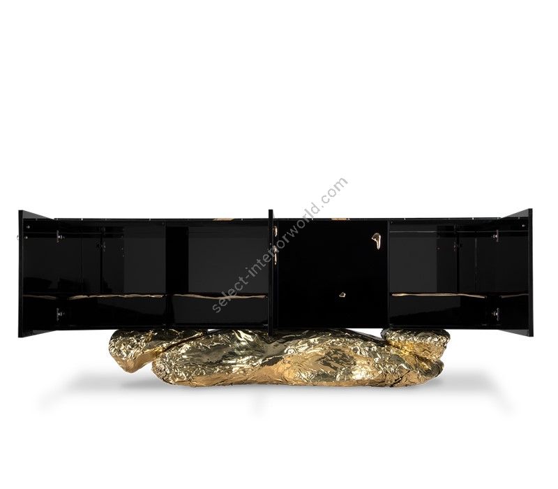 Bold yet elegant black and gold sideboard. The sharped body is fully covered in black high gloss, and it gently lies in an unexpected curved golden base conceived from hammered polished brass, inspired by the cliffs of the historical city of Angra do Heroismo in Azores island, Portugal.