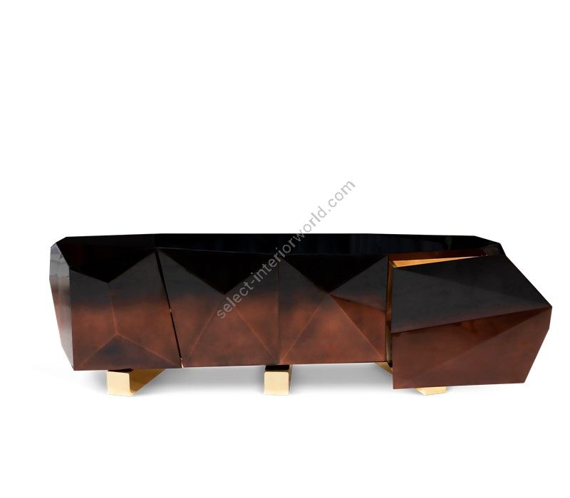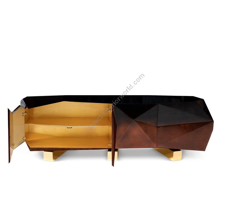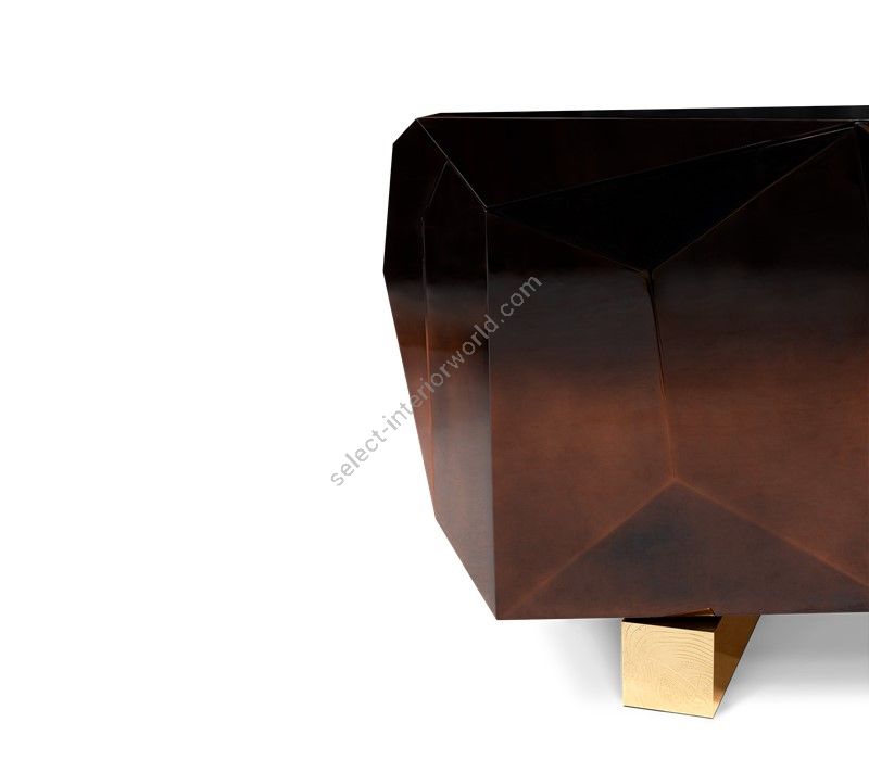 Time honoured masterpiece, the faceted Diamond sideboard is born as a subtle precious brown jewel with cutting-edge lines to challenge the boundaries of form. Influenced by the deconstructivism movement of postmodern architecture, the contemporary storage sideboard is conceived from wood and covered by gold leaf finished with a translucent shade of brown with gradient effect. It features two highly sculpted drawers and three doors, leading to a remarkable gold leaf interior and one shelf. Layer by layer, leaf gilding is one of the most treasurable and richest crafts techniques. An unexpected way to give a timeless touch and to carry the legacy of those who built it. The strong geometric design is coupled with three brass plated feet with casted brass details. A real expression of exclusivity and high collectible design.