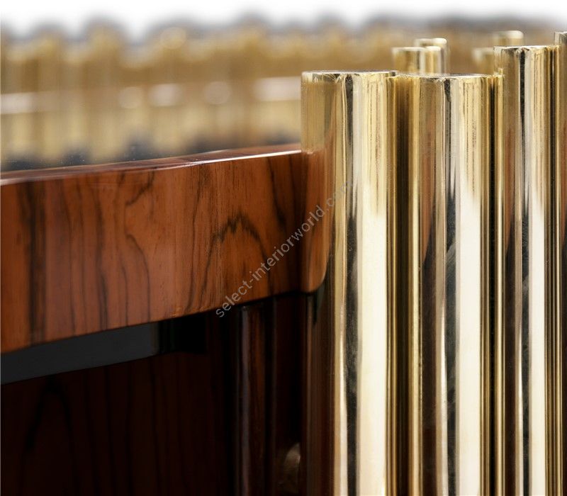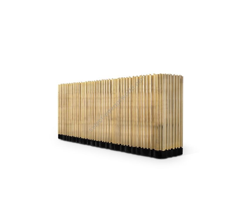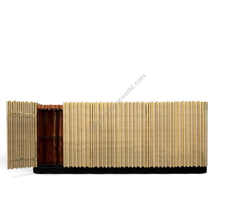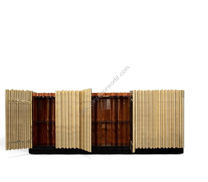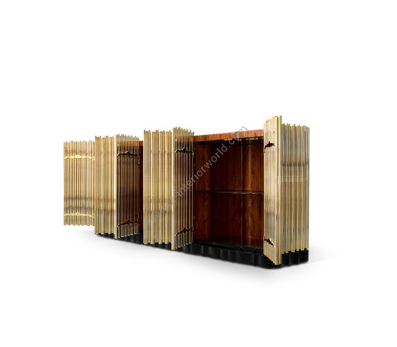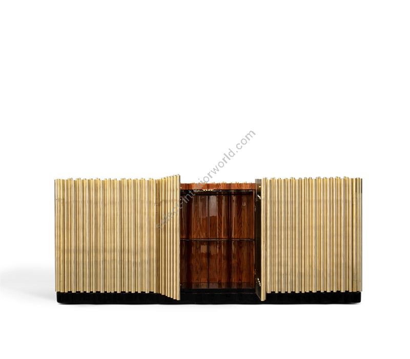 This buffet presents a strong wood body enveloped in a tubular cluster of either gold or nickel plated brass tubes, where each door is carefully welded with cutting edge-technology. A harmonious artful juxtaposition that adds rhythm and sophistication to any space. Symphony is wrapped up by a strong black lacquered base, while the top is finished in opaque black glass.