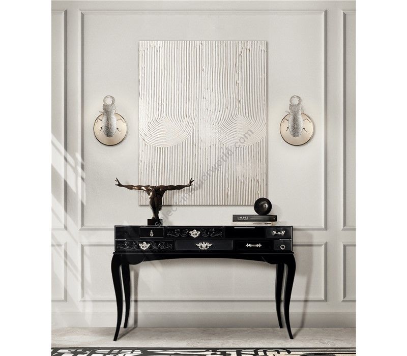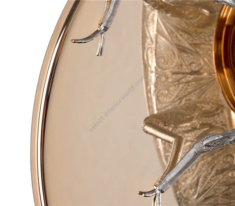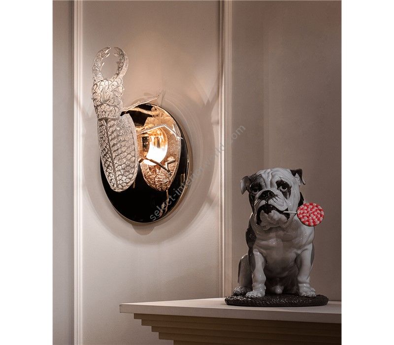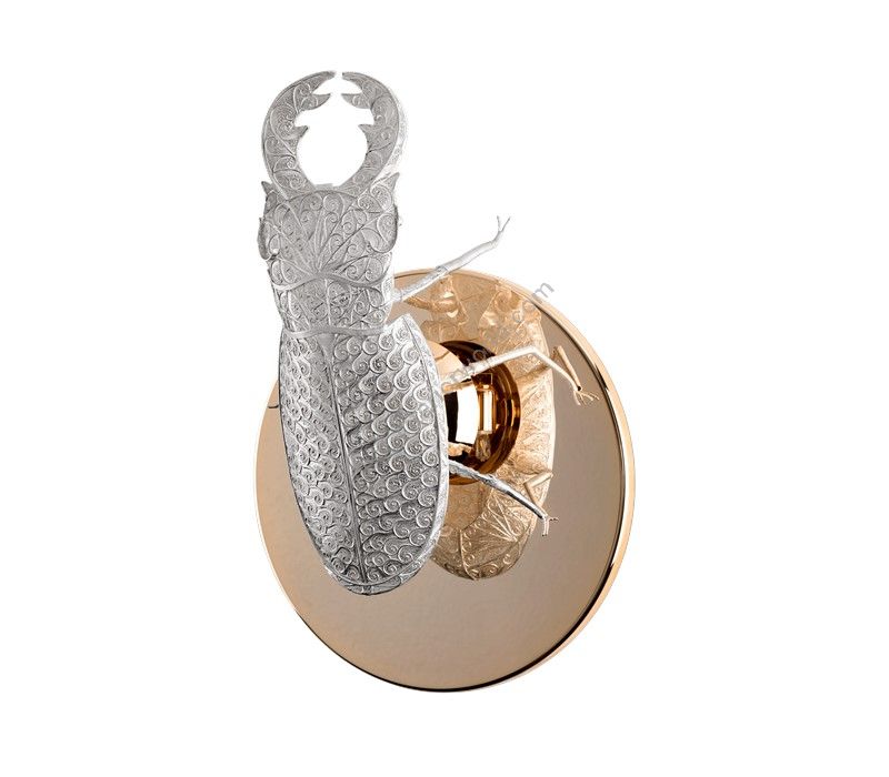 The Lucanus sconce brings a sophisticated symbiosis between a rare insect figure and the pure beauty of the silver filigree. The plate is made of polished brass and gold plated and completes this masterpiece.