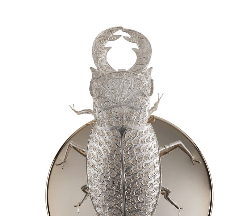 The Lucanus sconce brings a sophisticated symbiosis between a rare insect figure and the pure beauty of the silver filigree. The plate is made of polished brass and gold plated and completes this masterpiece. The stag beetle inspires Boca do Lobo, that takes the insects metamorphosis' idiosyncrasy as a metaphor to reflect the dynamic character of the brand itself, always challenging the perception of beauty through new design concepts and innovative techniques.