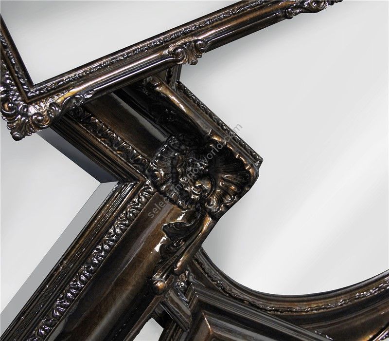 Root is a wall mirror with classic multiple carved frames finished in golden leaf rusted in high brilliance and grey mirror.