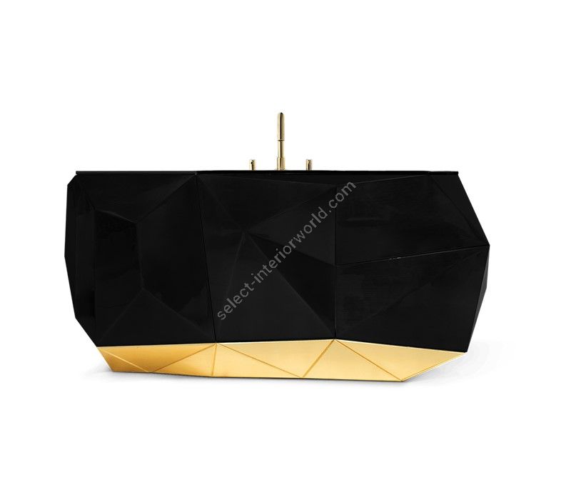 The Diamond Single Vanity Cabinet turns heads wherever it stands. It features a wooden structure finished in a high gloss black varnish, a color that contrasts perfectly with its interior, covered in gold leaf. This beautiful item has a built-in oval sink glass with a translucent black finishing that will add incredible luxury to any bathroom design.
