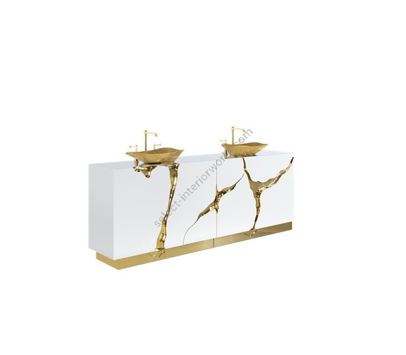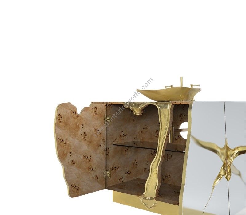 Structure: Sheet of stainless steel | Polished brass tears, High gloss varnish; Inside: Poplar Root Veneer; Four doors; Water drainage: Wall
