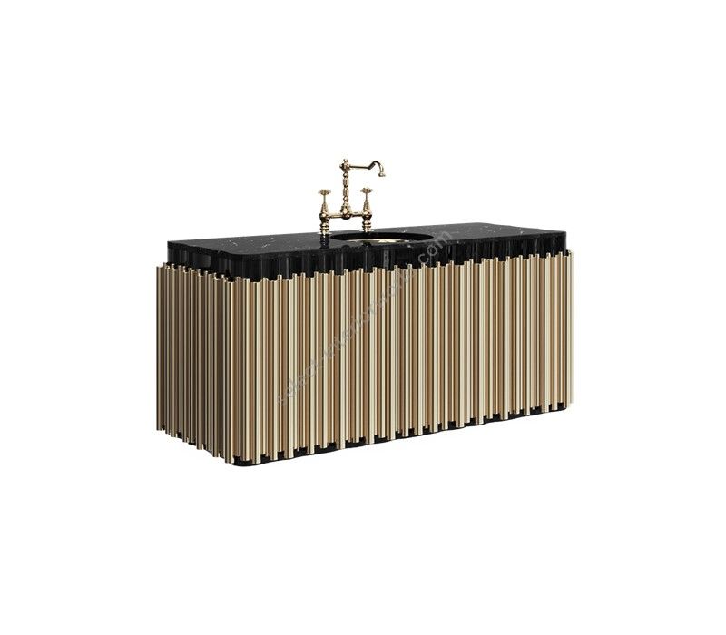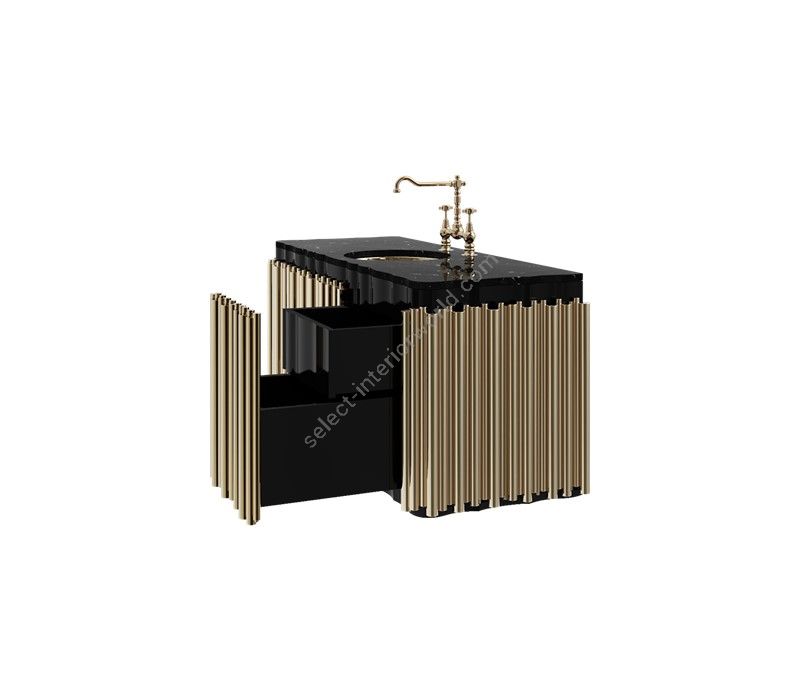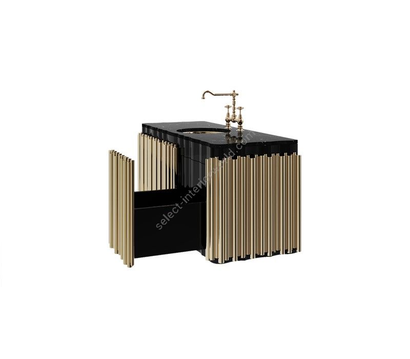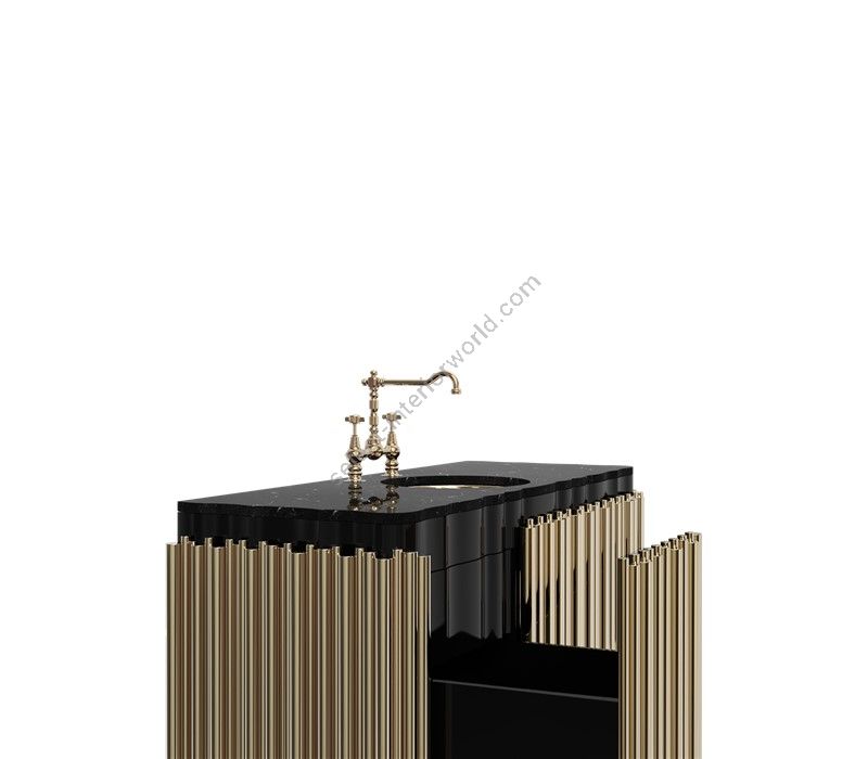 Structure: Wood, High Gloss Black Lacquered; External Structure: Gold Plated Brass Tubes, High Gloss Varnish; Top: Nero Marquina Marble; Sink: Polished Brass, High Gloss Varnish; Water drainage: Wall