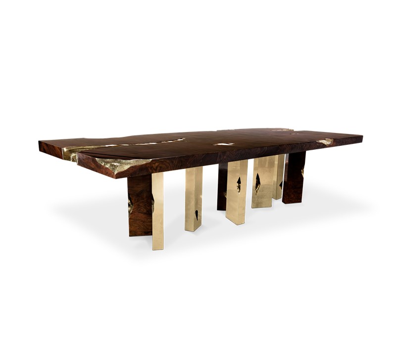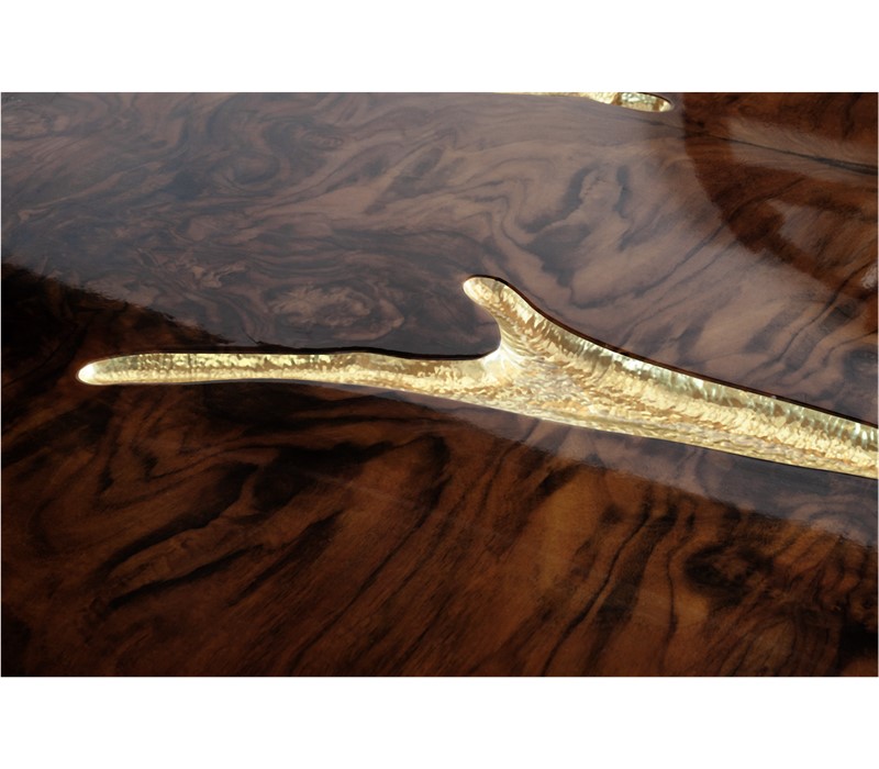 The Empire dining table’s surface is made in mahogany, coated in a fine wood veneer, with high polished brass details to fill the cracks. Its legs, also made from mahogany are finished the same way, and with polished brass sheets.