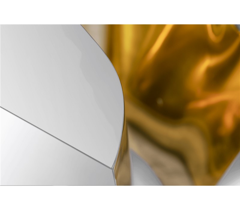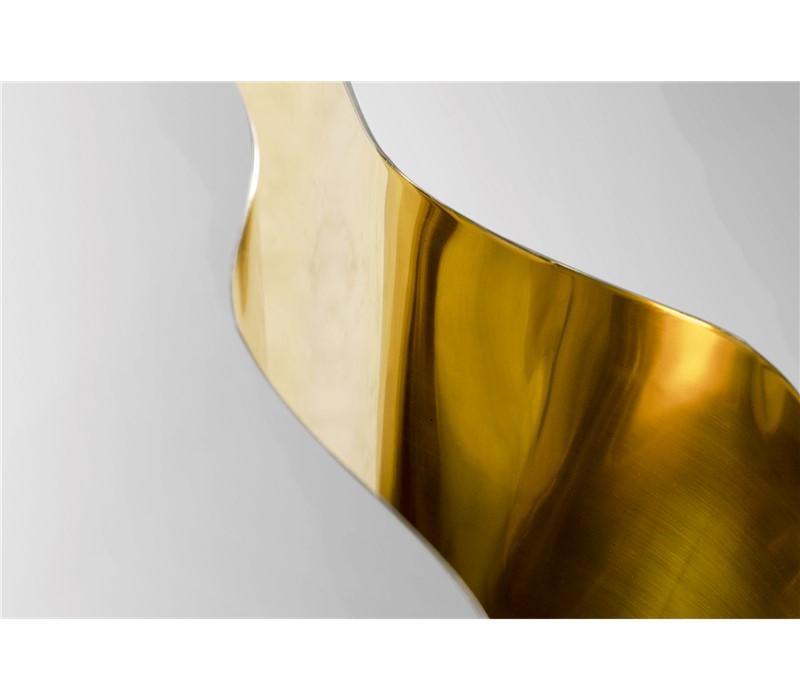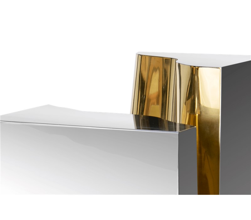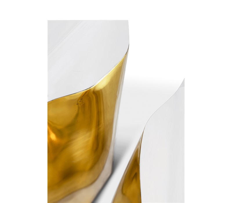 Its organic features are achieved through the manual fitting of the polished brass sheet, and a sharp exterior finished in polished stainless steel that portrays a perfect mirror. The hammered brass details and mirrored sides convey both dynamics and elegance, a beautiful duality between power and refinement to bring a new contemporary verve into interior design.