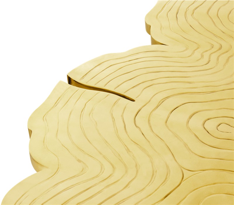 Made in wood and polished brass, this upscale dining table incorporates richest nature-inspired design, industrious welding techniques and a manually engraved top that emulates the outlines of log rings, reminding the timeline of a tree. Below the expansive 8 seat dining table top is an elegant composition of two scaled organic brass tubes.