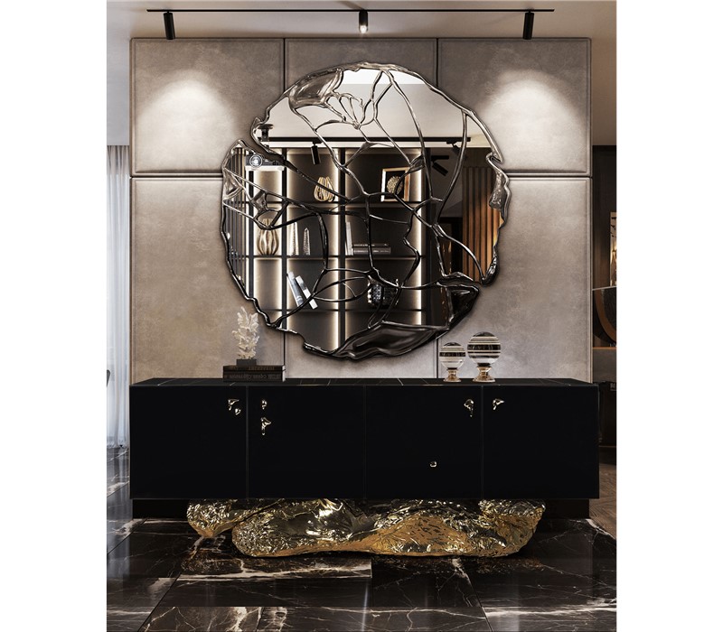 Sophisticated pulls in different organic shapes adorn four doors, each one opens to single drawers on each compartment. A wonderful journey through the know-how of the best craftsmanship that ends with exquisite Shara Noir marble on top.