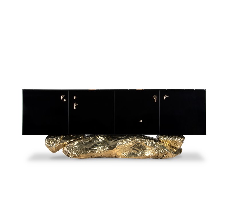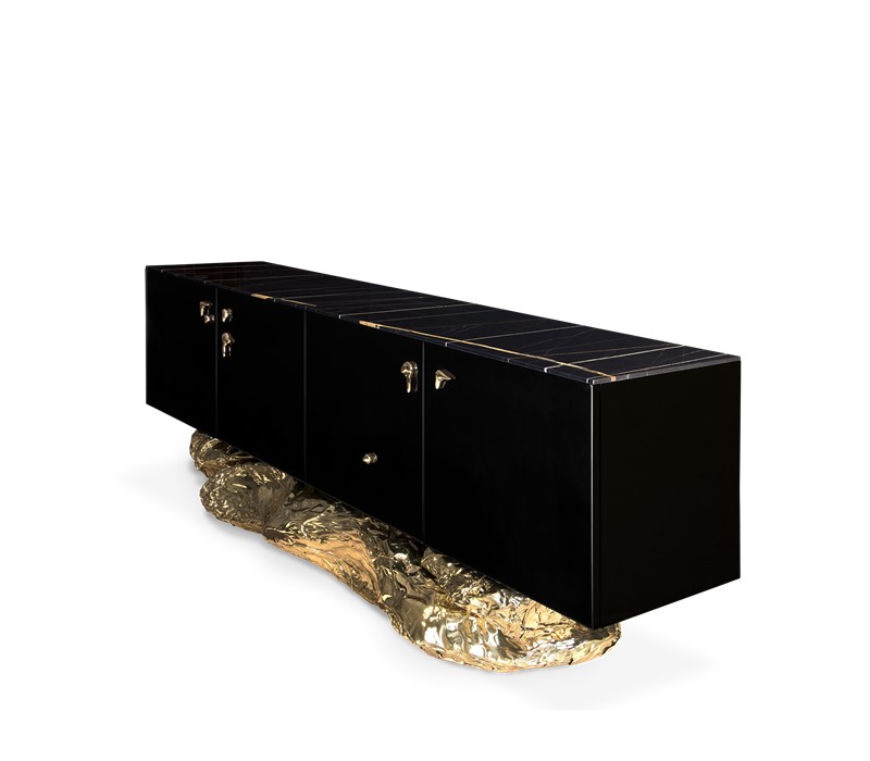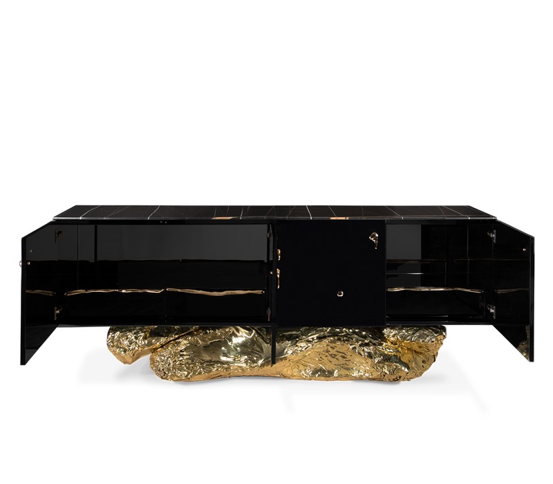Bold yet elegant black and gold sideboard. The sharped body is fully covered in black high gloss, and it gently lies in an unexpected curved golden base conceived from hammered polished brass, inspired by the cliffs of the historical city of Angra do Heroismo in Azores island, Portugal.