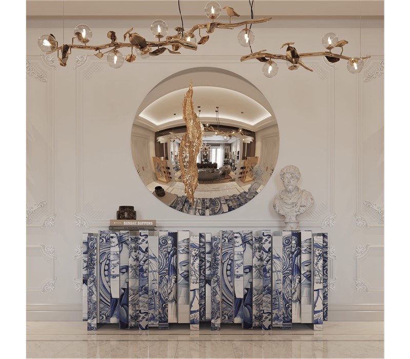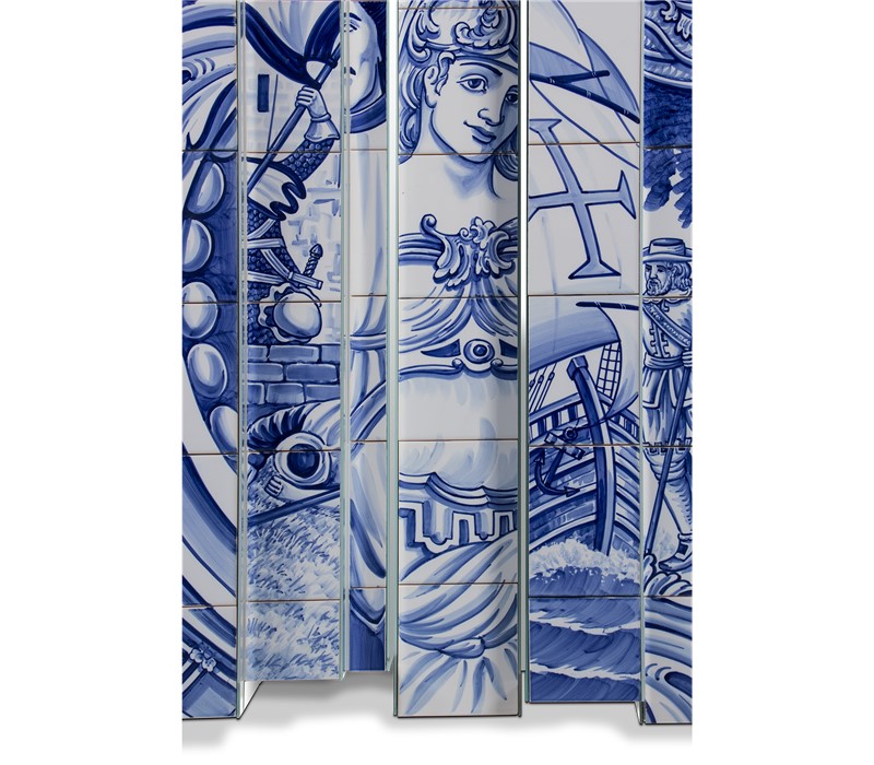 The Heritage Sideboard is a magnificent journey through Portuguese legacy. Covered in Azulejos, traditional hand painted tiles and one of the most representative art forms of Portuguese culture, the architectural sideboard portrays different scenes from the country’s Discoveries era. Centuries of history are gathered in a single final panel, and each layer is enhanced by vertical mirrors on the lateral surfaces. The hint of wander through the rich legacy continues when two door open to a lined glossy gold leaf interior, and a classical ornament trim reminds the inside of churches and rich buildings. A clear glass shelve can be seen on the two individual divisions of the sideboard. A statement sideboard, the Heritage can take center stage in the most elegant rooms since its back is also fully hand painted. A lengthy tradition of bespoke and exclusivity to make one-of-kind design pieces.