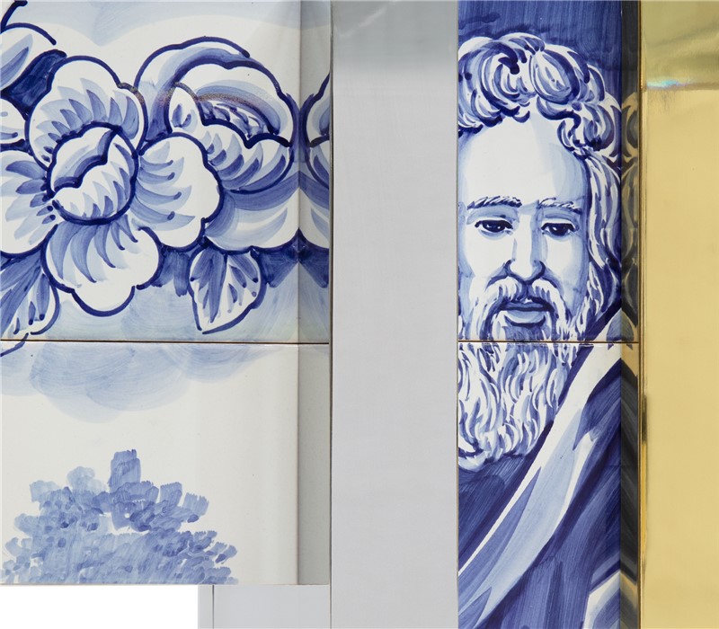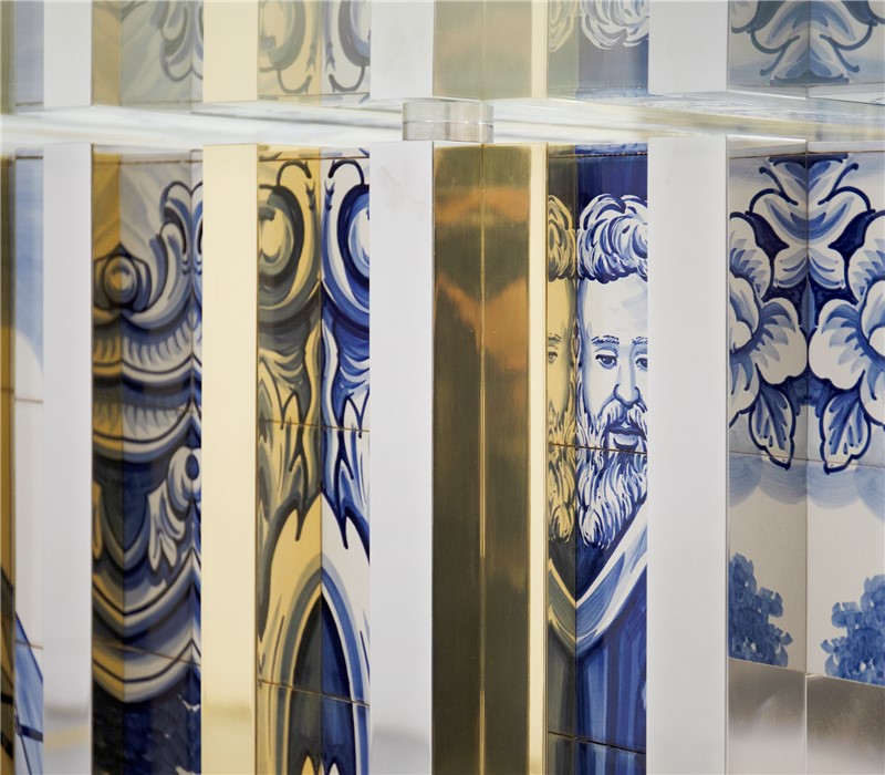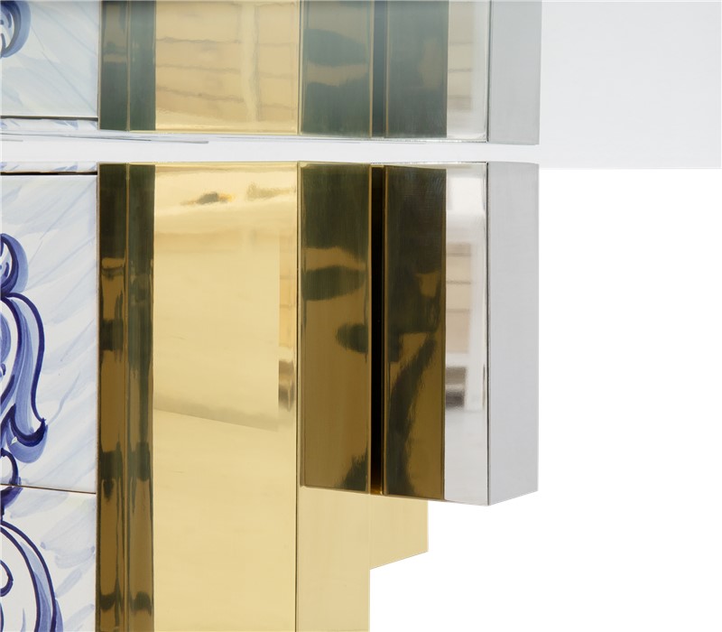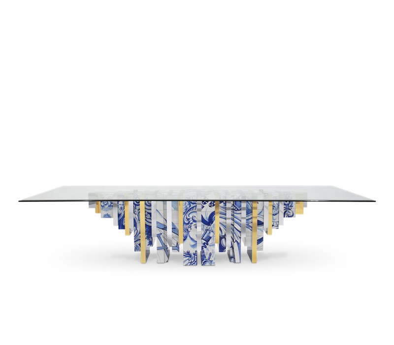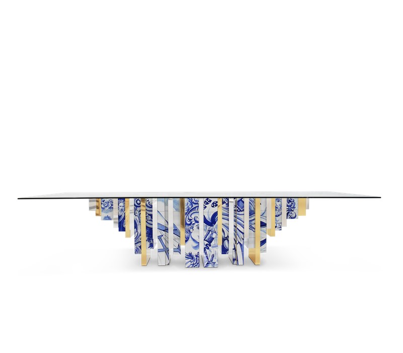 The Heritage Dining Table, much like its sibling Heritage Sideboard and Cabinet, is a highly sophisticated piece inspired by Portuguese history through the use of traditional hand painted azulejo tiles. Its noble design features bold lines, with alternating polished brass, bevelled mirror and azulejo strips and a tempered glass top, which reflect your dining room’s finest elements, yet adding a touch of warmth and finesse.