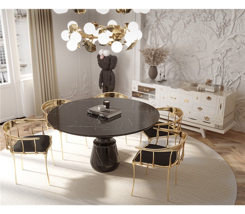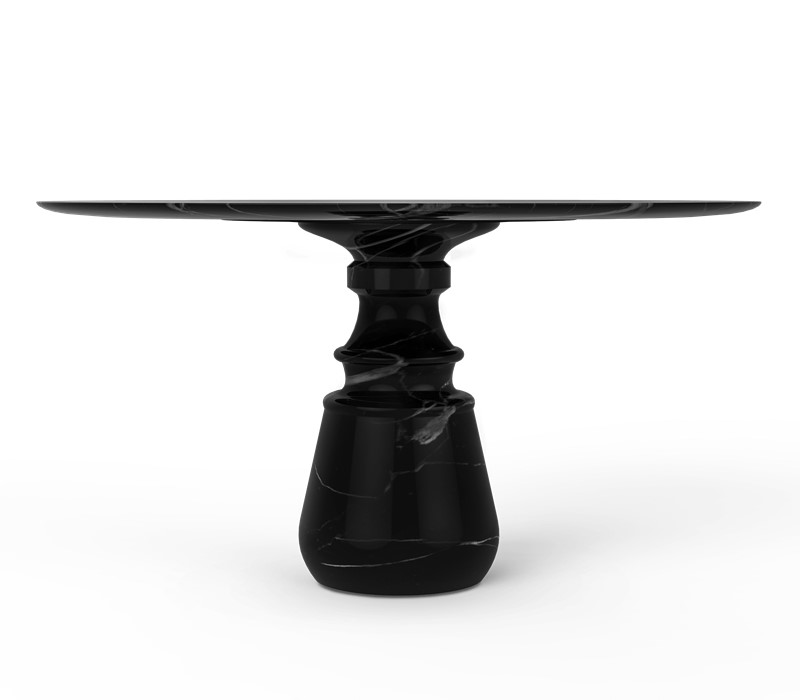 Playing with function and sculptural form, Pietra dining table shapes a timeless experience through its classical aura and finest Nero Marquina black marble. Reminding the renaissance era, its round top gently lies in one robust marble column, conceived from a solid block hand-sculpted and turned to create different details for additional texture. A noble material carved in Boca do Lobo workshops, conceiving a statement black table ideal for a grand entryway, elegant dining rooms or other open settings. Ideal as a four-seater table, the contemporary feel of Pietra is effortlessly stylish and it is suitable for indoor or outdoor use.