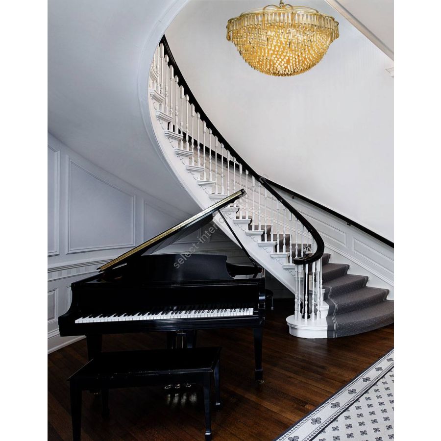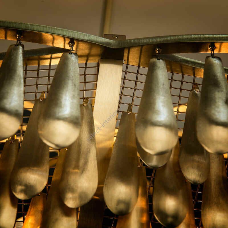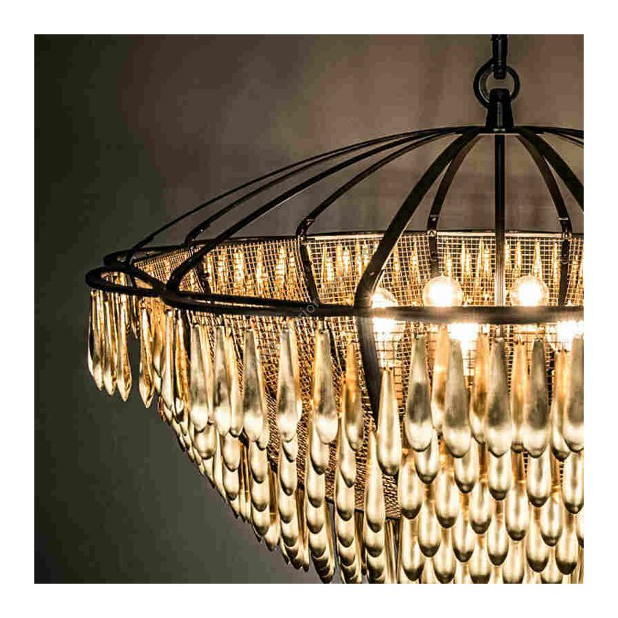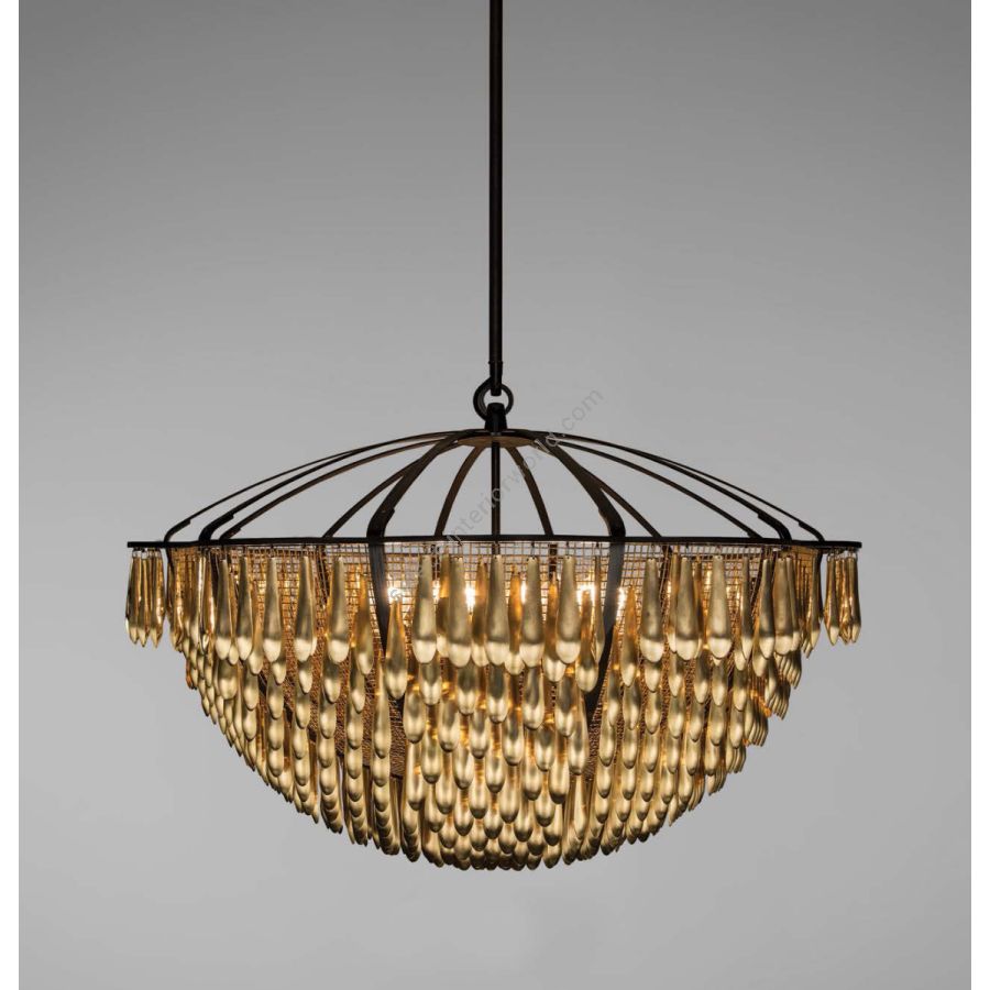 San Miguel is inspired by the church bells of San Miguel de Allende in Mexico. The fixture is built of solid brass and composed of nearly 1,000 drops that dangle “live” from mesh panels. When the drops catch the slightest breeze, it “sings” gently with the tinkling sounds of a wind chime. When the drops catch the light, the polished inside surfaces sparkle and disperse a golden glow over the matte outside surfaces.