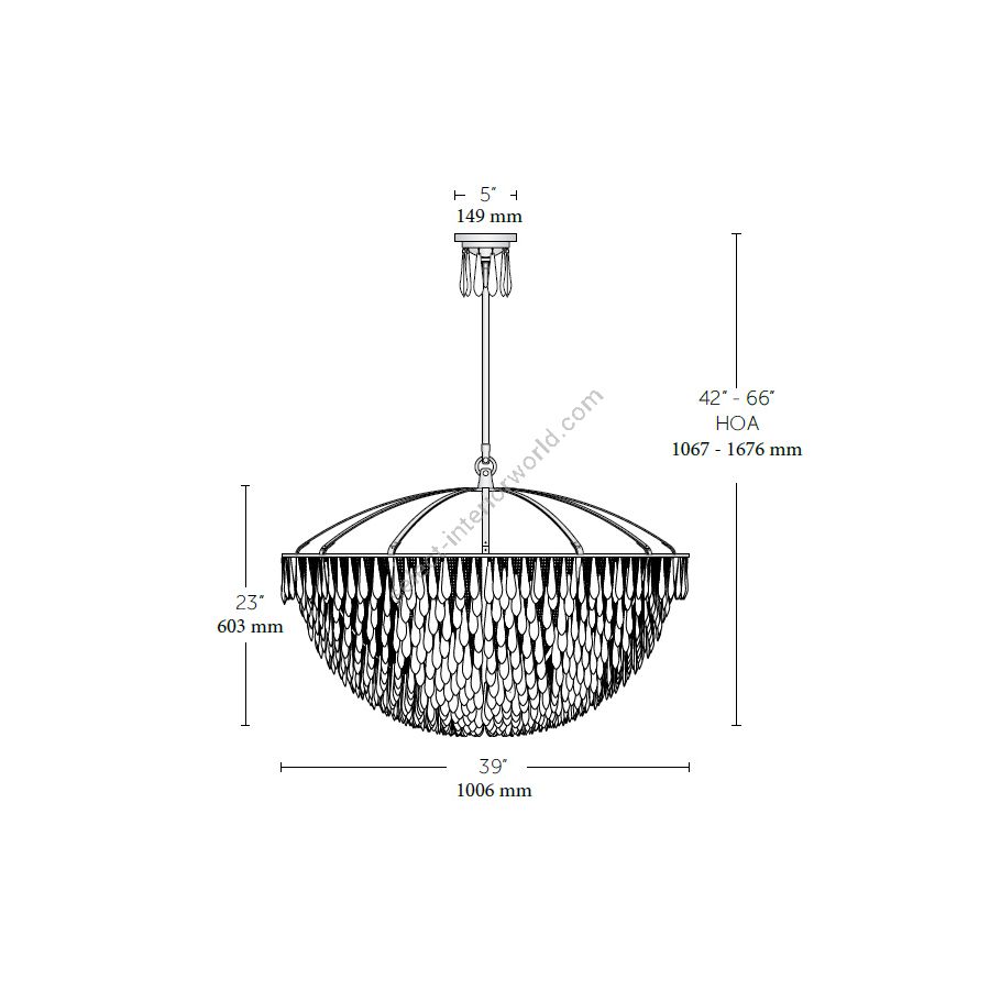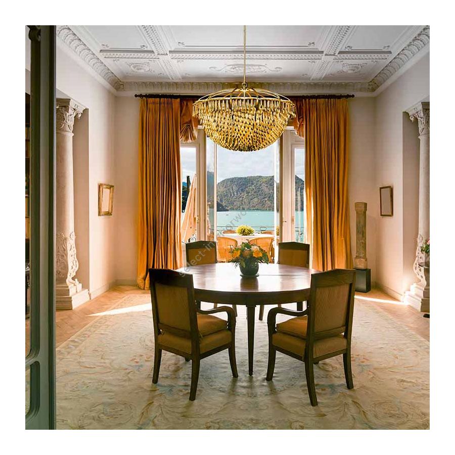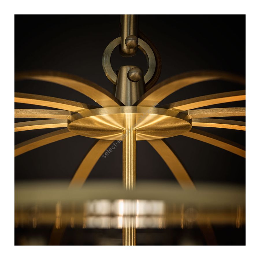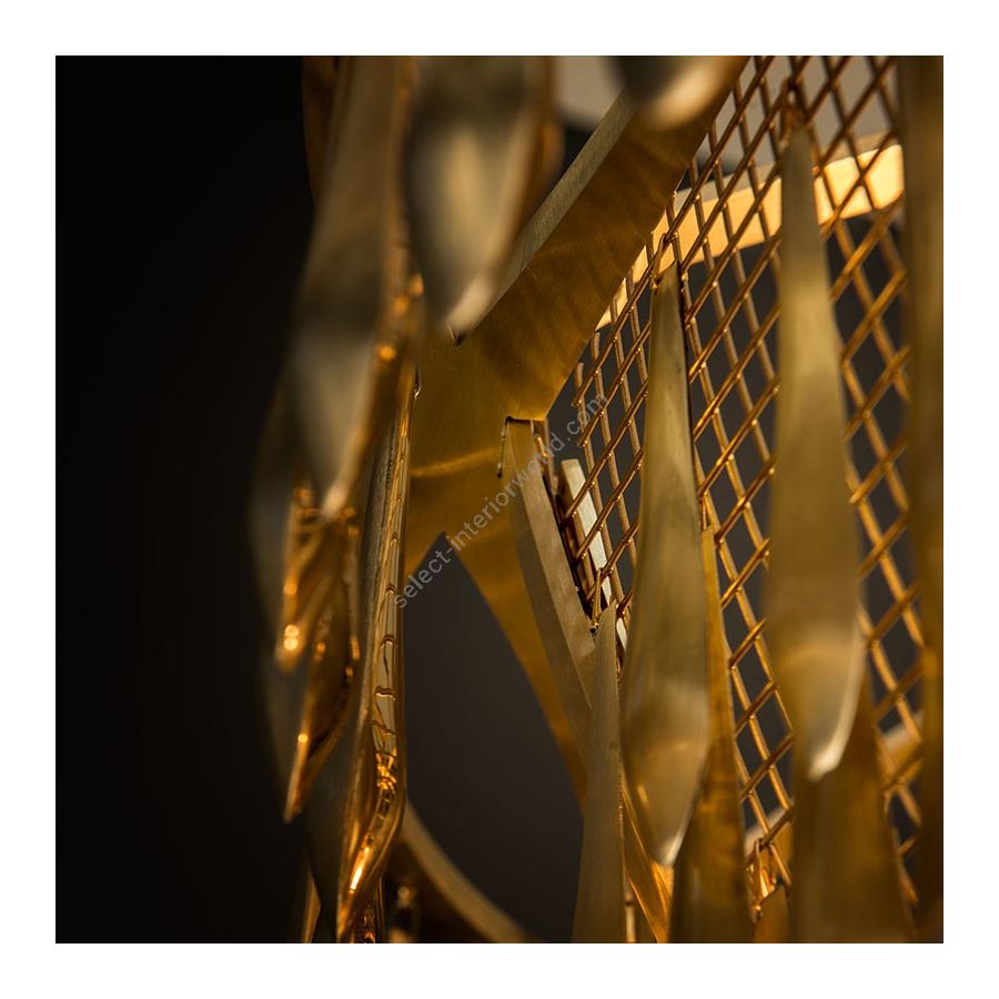 San Miguel is inspired by the church bells of San Miguel de Allende in Mexico. The fixture is built of solid brass and composed of nearly 1,000 drops that dangle “live” from mesh panels. When the drops catch the slightest breeze, it “sings” gently with the tinkling sounds of a wind chime. When the drops catch the light, the polished inside surfaces sparkle and disperse a golden glow over the matte outside surfaces.