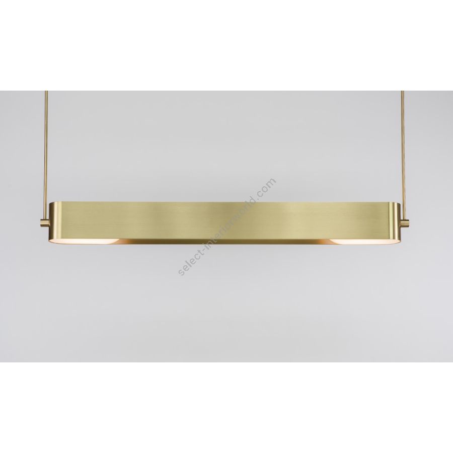 A beautiful linear hand-finished loop of brass that gently cradles a curvilinear white cased glass diffuser at either end. Patent Designs: D948,772.