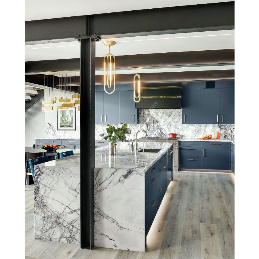 A thin profile brings airiness and minimalism to this elegant series of pendants designed by Doyle Crosby. Square tubes of hand-finished brass form geometric crisscrossing double obround loops that illuminate from within satin white diffusers.