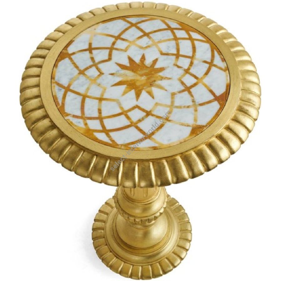 Arabesque is a precious coffee table with a classic decorative spirit, characterized by a marble top with an ornamental motif created by water-jet processing, and a structure with hand-carved details with a gold leaf finish. A sophisticated piece of furniture, perfect for creating corners with a suggestive charm in the living area.