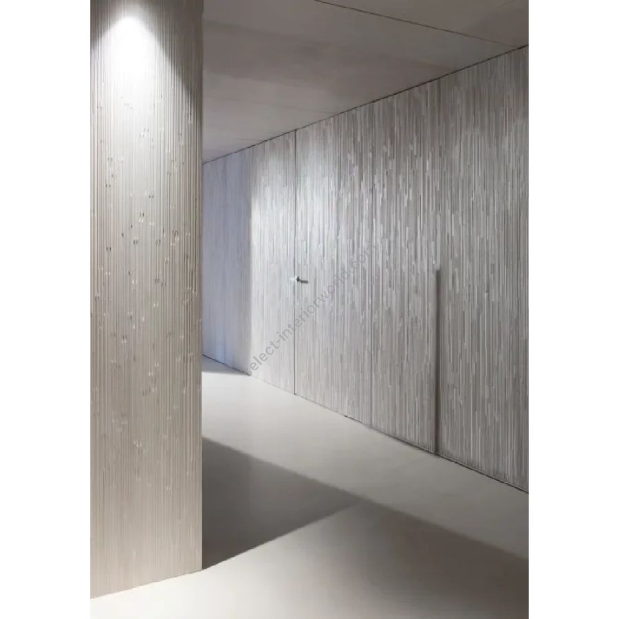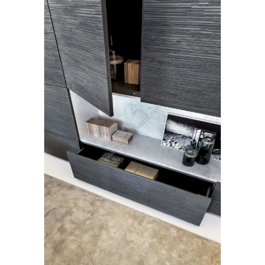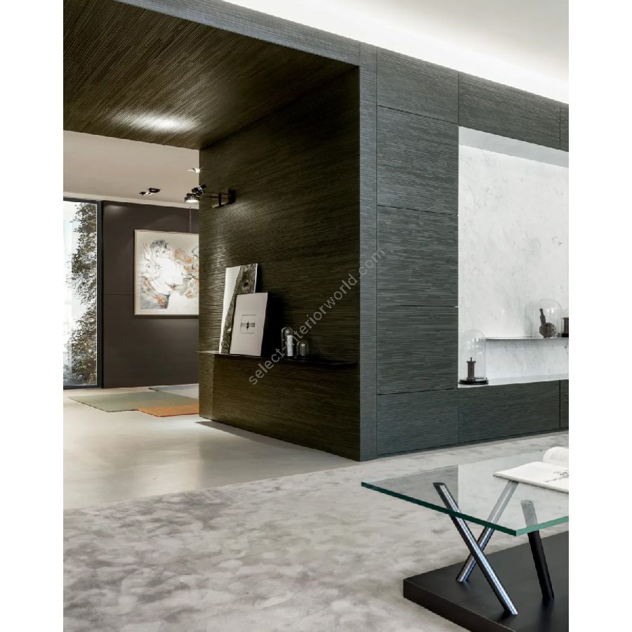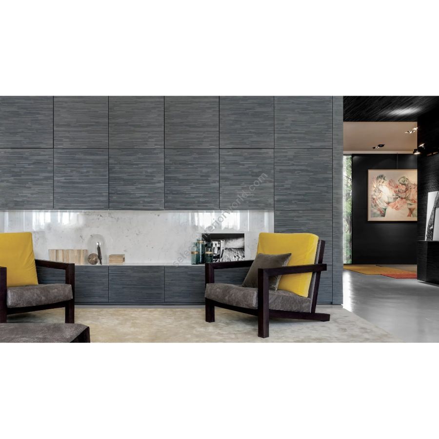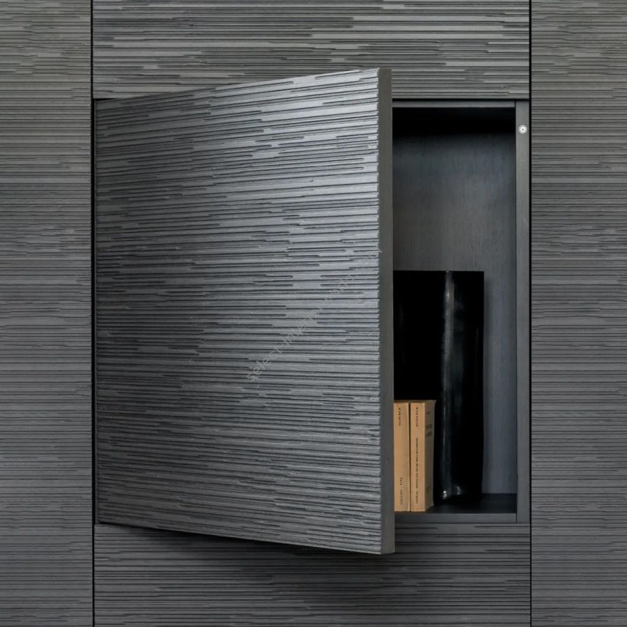 Cabinet system for the living area with horizontal or vertical Decor carving. Available in modules of different sizes, with customized niches and accessories, and with integrated LED lighting.