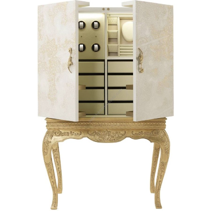 The pieces of the Brocart line showcase a refined style that evokes the luxury of the 17th and 18th century French noble courts. They present a base with hand-carved legs and antique gold-leaf finishes in pure classic style, combined with an upper part featuring a more essential and linear volume. The ornamental theme evokes the Cant lace, a motif of the Italian manufacturing tradition, present in the Cant territory since the XVIIth century, and is achieved through a special laser processing that allows carving of the top layer of lacquer to create the design.