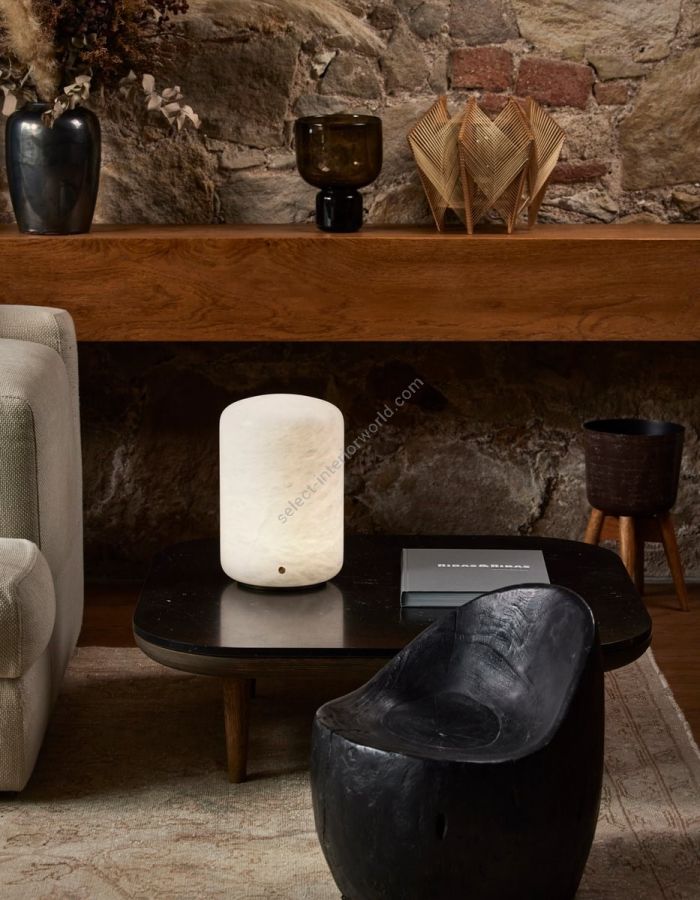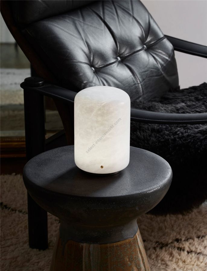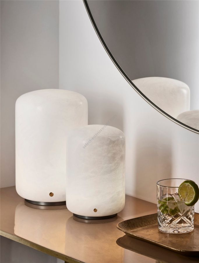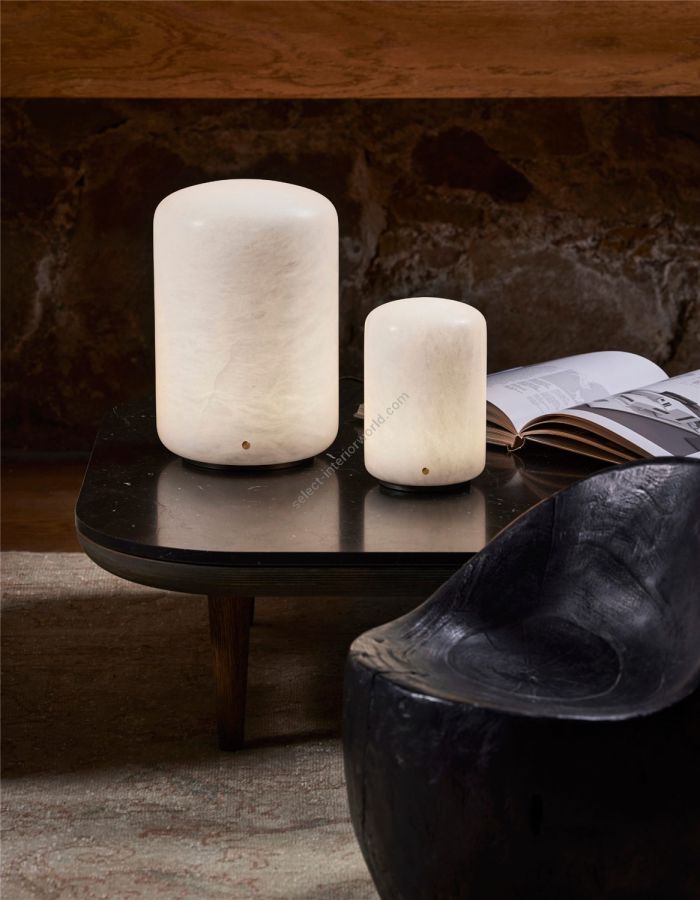 Capsule is a family of lamps that maximizes the use of alabaster to provide soft light in any space, whether public or residential. With cylindrical forms and gentle curves, these lamps deliver uniform illumination that highlights the depth and unique textures of alabaster. Each piece is individually cut and shaped using material sourced from northern Spain, supporting local manufacturing. Due to the natural characteristics of the material, colors and veining vary, making each lamp unique. Mounted on a slim bronze base, the light intensity can be adjusted via a discreet touch dimmer.