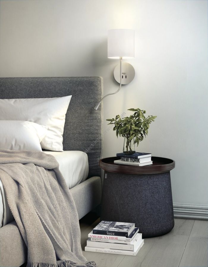 Hotel Phyton combines elegant design and functionality in a wall lamp created for spaces where comfort and practicality are essential. Its metal structure and textile shade provide soft, welcoming ambient light, while the integrated LED reading light adds a focused beam for specific tasks. The two switches on the base ensure ease of use, making it ideal for bedrooms and hotels that prioritize lighting adapted to the user’s needs.