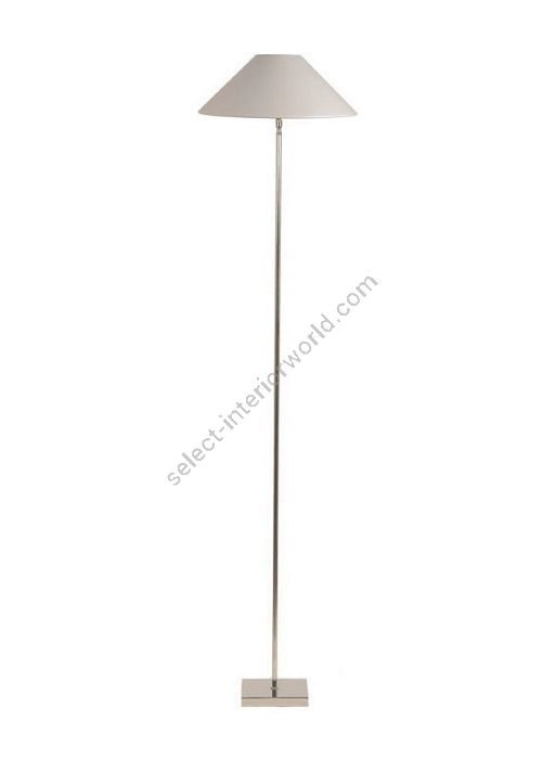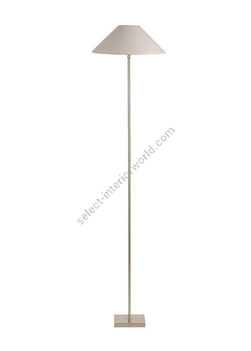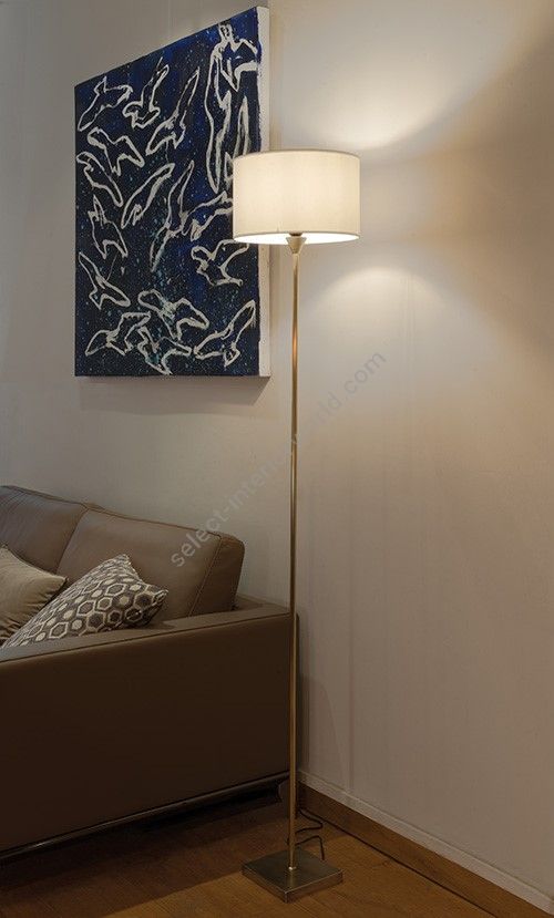 Floor lamp in brass. Made with a round tube on a square base. This sober and elegant floor lamp remains discrete in your interior. Available in black or matt gold patina, and in nickel or brushed nickel. Also exists in small size (LD12). Presented lamp shade in white cotton chintz in a conical shape (see other available shapes and colours)