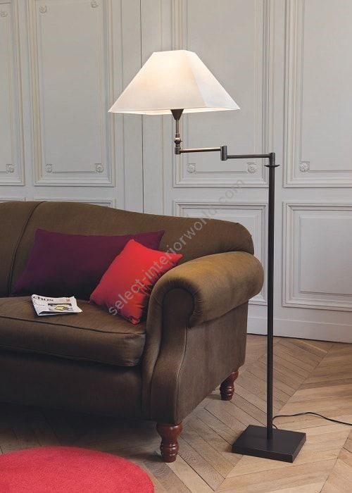 Floor lamp in brass. Made with a round tube with a swing arm, on a square base. This contemporary floor lamp gives a deported lighting thanks to its swing arm. Available in black or matt gold patina. Presented lamp shade in white cotton chintz in a tall square shape (see other available shapes and colours)