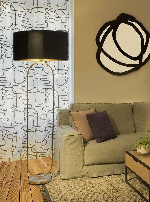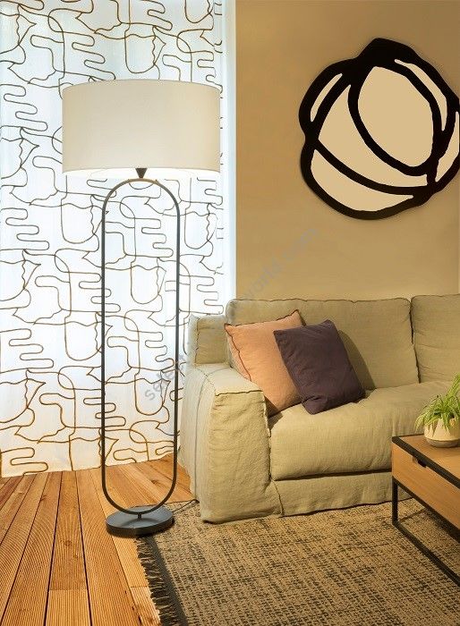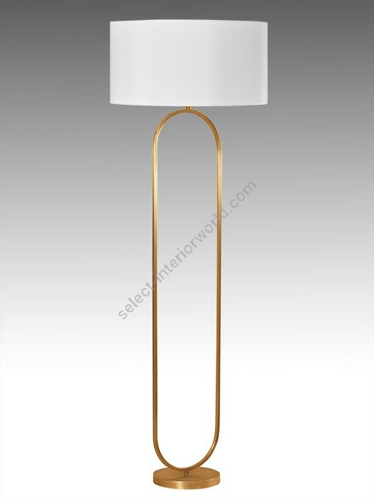 Floor lamp made in brass It is made with a square tube forming an harmonious oval on a round base This floor lamp with an elegant design nicely decorates a living room, a bedroom or an office Available in black or matt gold patina Presented cylindrical shade in white cream chintz (see other available colors)