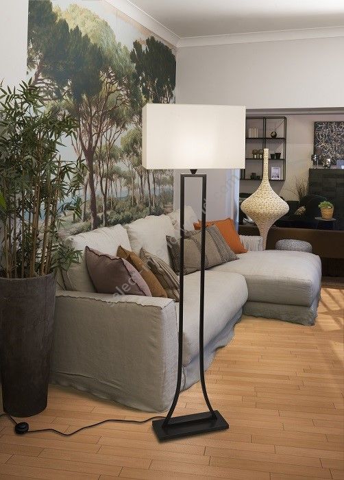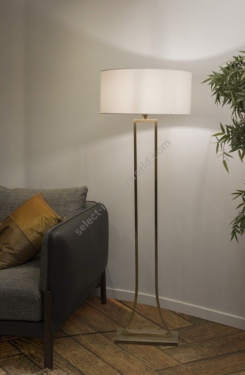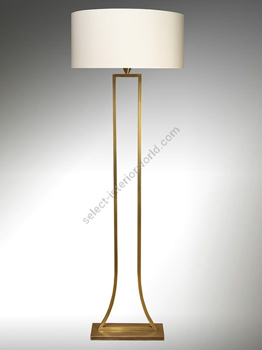 Floor lamp made in brass It is made with two square tubes forming harmonious curbs on a rectangular base This floor lamp with an elegant design nicely decorates a living room, a bedroom or an office Available in black or matt gold patina Presented cylindrical shade in white cream chintz (see other available shapes and colors)