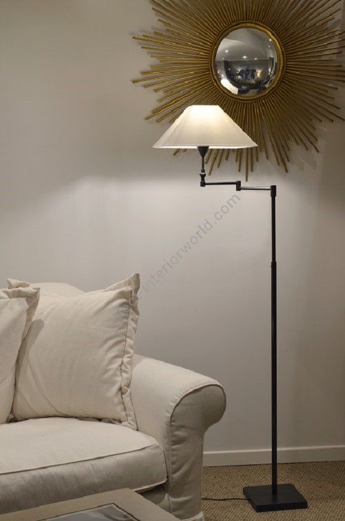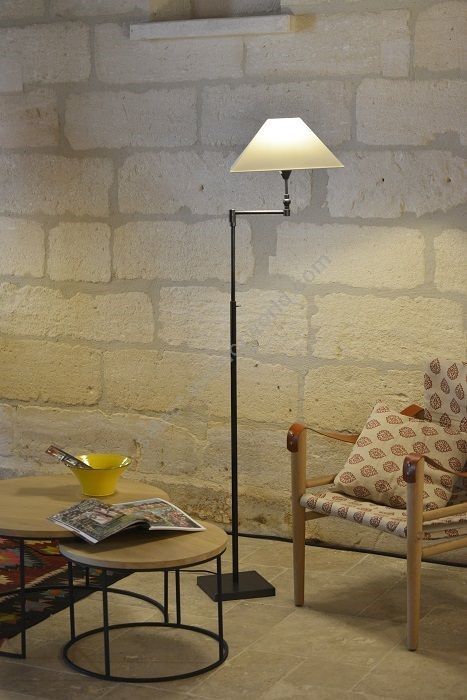Floor lamp in brass. Made with a ajustable round tube with a swing arm, on a square base. This contemporaryl floor lamp gives a deported lighting thanks to its adjustable tube and its swing arm. Available in black or matt gold patina. Presented lamp shade in white cotton chintz in a conical shape (see other available shapes and colours)