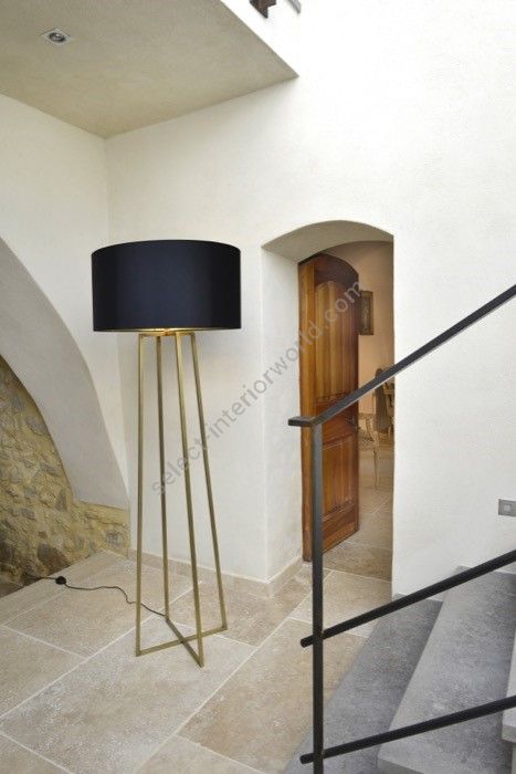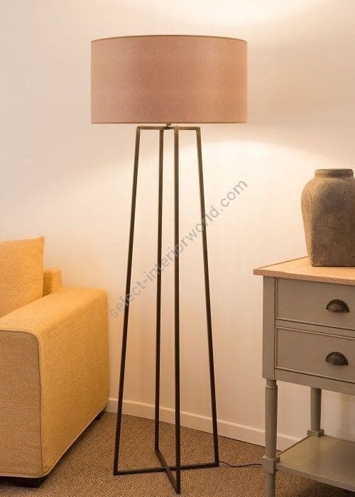 Floor lamp in brass. Made with 4 inclined square tubes, joined at their end by 2 crossed tubes. This contemporary floor lamp gives an original design to your interior. Available in black or matt gold patina. Presented lamp shade in beige striated chintz in a cylindrical upright shape (see other available shapes and colours)