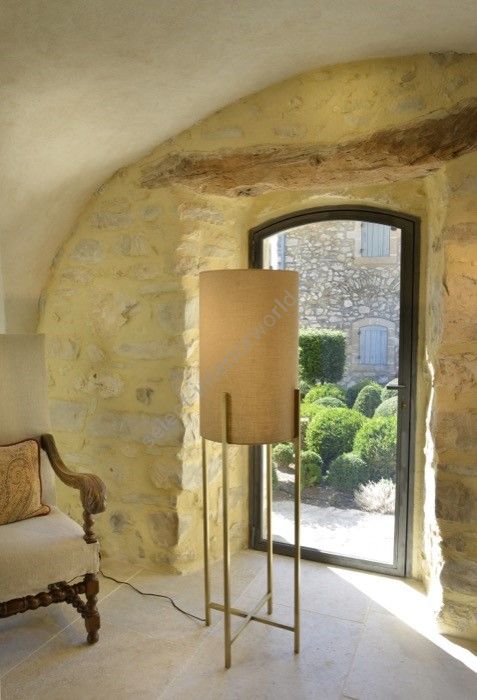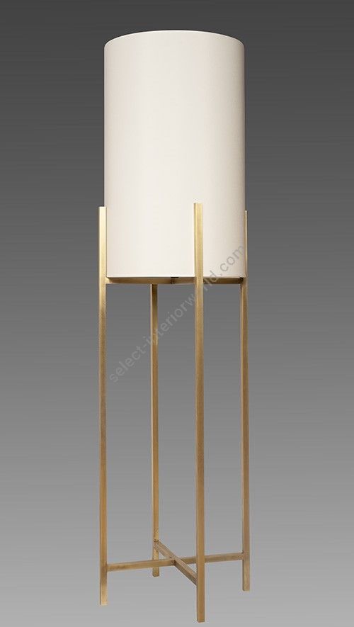 Floor lamp in brass. Made with 4 vertical square tubes, joined in their middle by 2 crossed tubes. This contemporary floor lamp gives an original design to your interior. Available in black or matt gold patina. Presented lamp shade in white cotton chintz in a cylindrical shape (see other available colours)