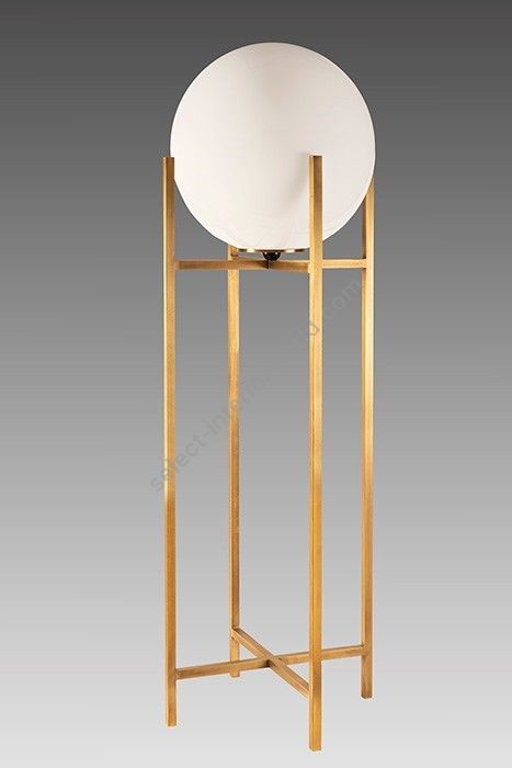Floor lamp in brass. Made with 4 vertical square tubes, joined in their middle by 2 crossed tubes. This contemporary floor lamp gives an original design to your interior. Available in black or matt gold patina. White glass globe (supplied)