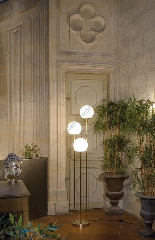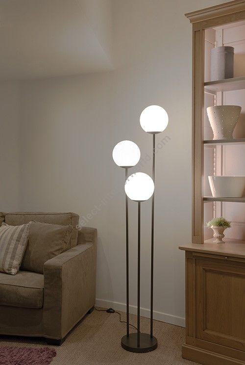 Floor lamp in brass. Made with 3 round tubes of various height on a round base. This design floor lamp gives an original touch to your interior. Available in black or matt gold patina. 3 white glass globes (supplied)