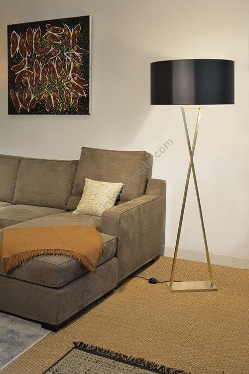 Floor lamp made in brass. Made with 2 rectangular tubes making triangles on a rectangular base. This floor lamp with an original and elegant geometric design will bring a touch of modernism in your interior. Available in black or matt gold patina. This model is also available in table lamp (L196) and in wall light (AL196). Presented lamp shade in white cream chintz in a cylindrical shape (see other available shapes and colours)