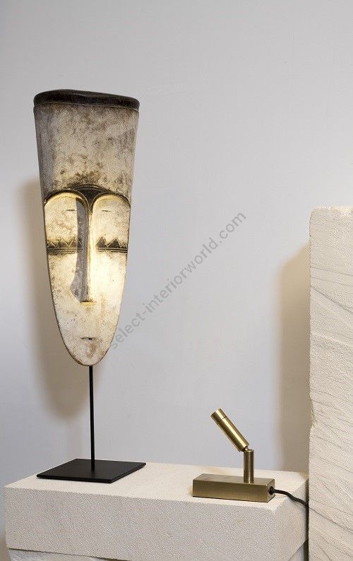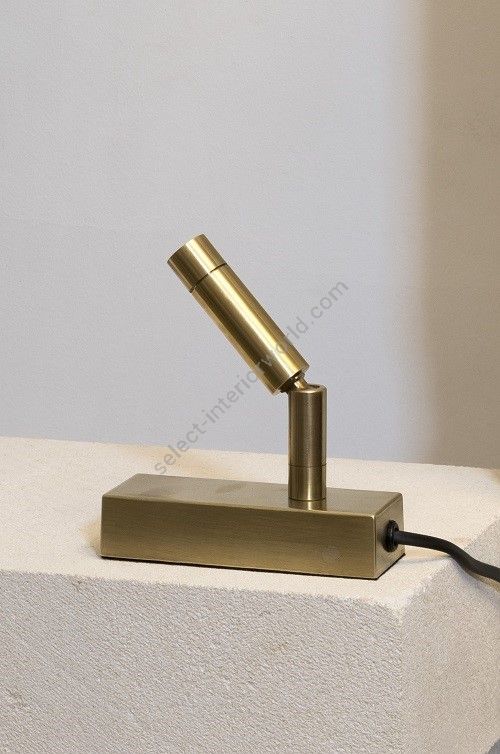 Table spot made in brass It is made with a cylindrical led light on a rectangular base This table spot with a sober and elegant design highlights a painting, a sculpture, a furniture Available in black or matt gold patina.