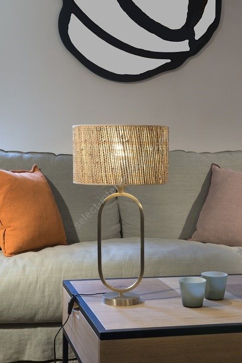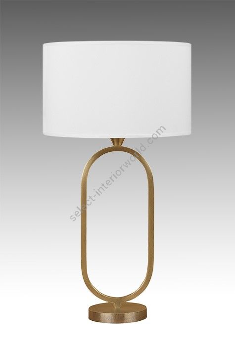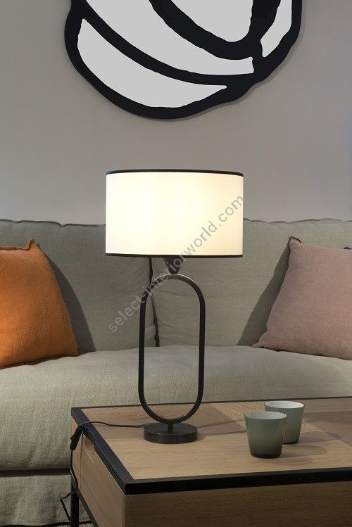 Table lamp made in brass It is made with a square tube forming an harmonious oval on a round base This lamp with an elegant design nicely decorates a living room, a bedroom or an office Available in black or matt gold patina Also available in larger size (L203B) Presented cylindrical shade in white cream chintz (see other available colors)
