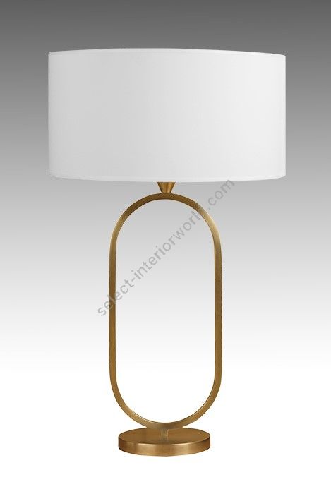 Table lamp made in brass It is made with a square tube forming an harmonious oval on a round base This lamp with an elegant design nicely decorates a living room, a bedroom or an office Available in black or matt gold patina Also available in smaller size (L203A) Presented cylindrical shade in white cream chintz (see other available colors)
