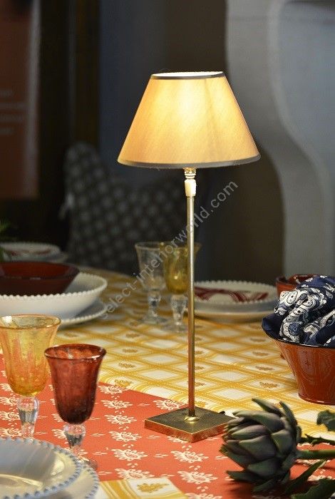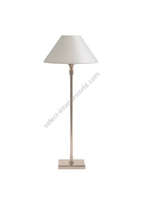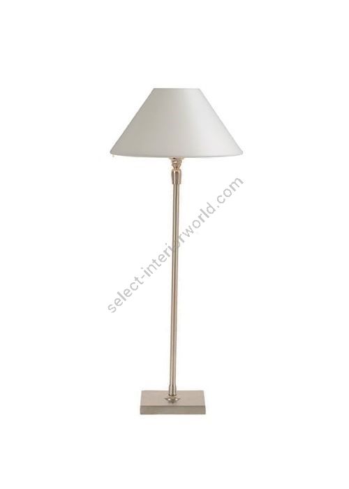 Lamp made in brass. Made with a round tube on a square base. This contemporary lamp discretely decorates your interior. Available in black or matt gold patina, and in nickel or brushed nickel. Also exists in small (L20D) or in large size (L20F). Presented lamp shade in white cotton chintz in a conical shape (see other available shapes and colours)