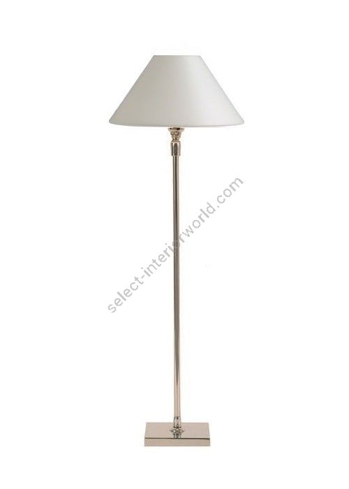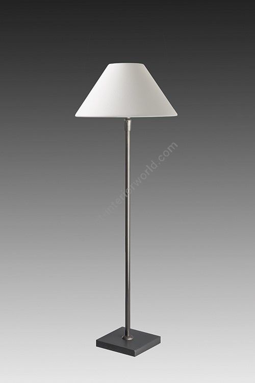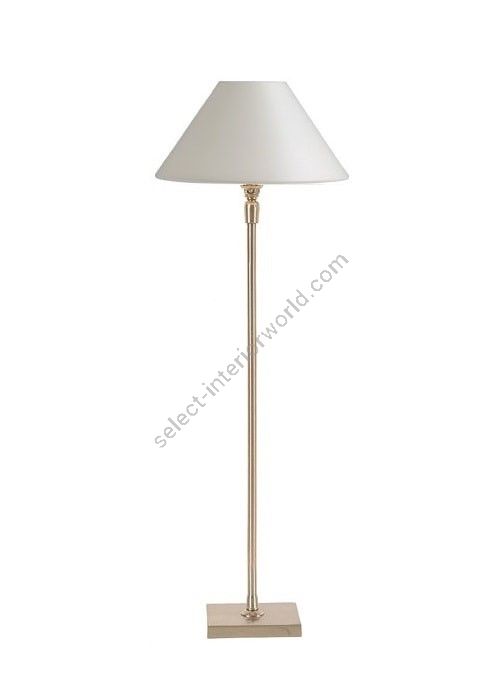 Lamp made in brass. Made with a round tube on a square base. This contemporary lamp discretely decorates your interior. Available in black or matt gold patina, and in nickel or brushed nickel. Also exists in small (L20D) or in medium size (L20E). Presented lamp shade in white cotton chintz in a conical shape (see other available shapes and colours)