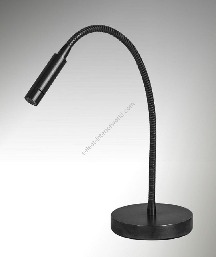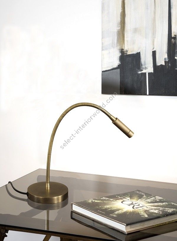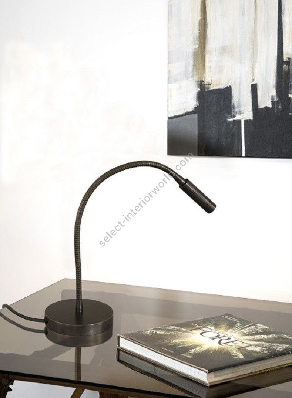 Led table lamp in brass. It is made with a 40cm flex with a led light on a round base. This reading lamp offers a sober and elegant design, and a direct and efficient light for an office table. Available in black or matt gold patina