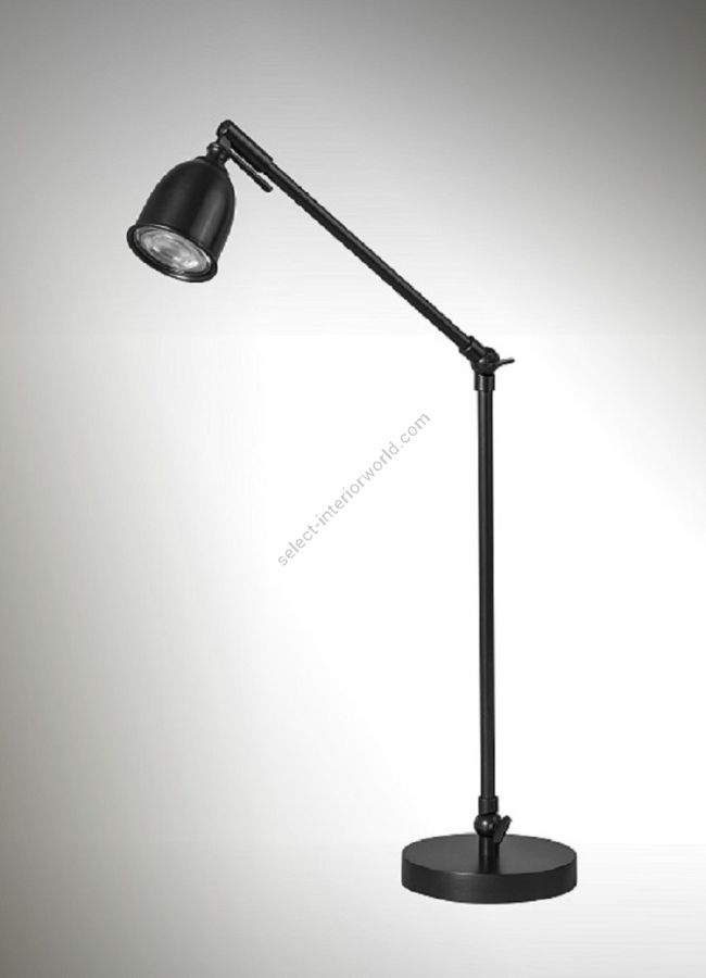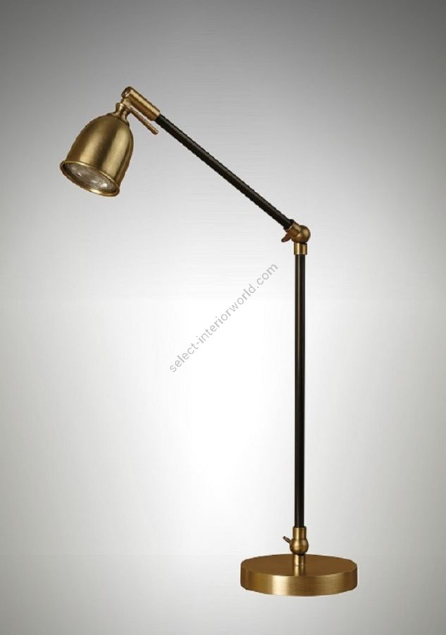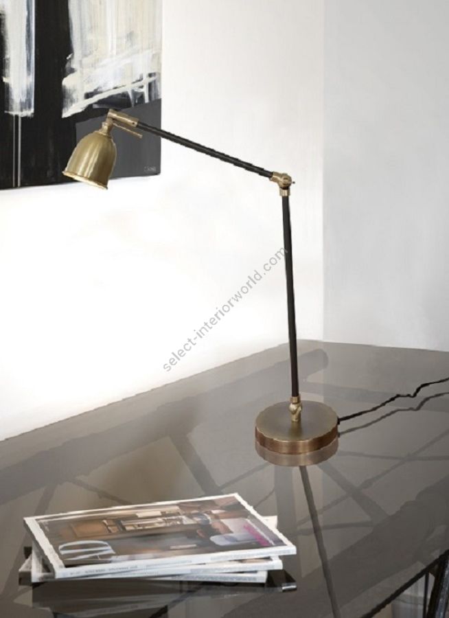 Table lamp in brass. Made with a round tube with a double pivoting arm on a round base, with a pivoting reflector. This elegant table reading lamp gives an efficient direct lighting. Available in black or bicolor (black and matt gold) patina