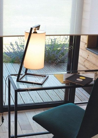 Lamp in brass. This model has been created by designer Sandra Hellmann ©. Made with a inclined rectangular frame on a square frame. This contemporary lamp gives a original design to your interior. Available in black patina. Presented lamp shade in white cotton chintz in a cylindrical shape (see other available shapes and colours)